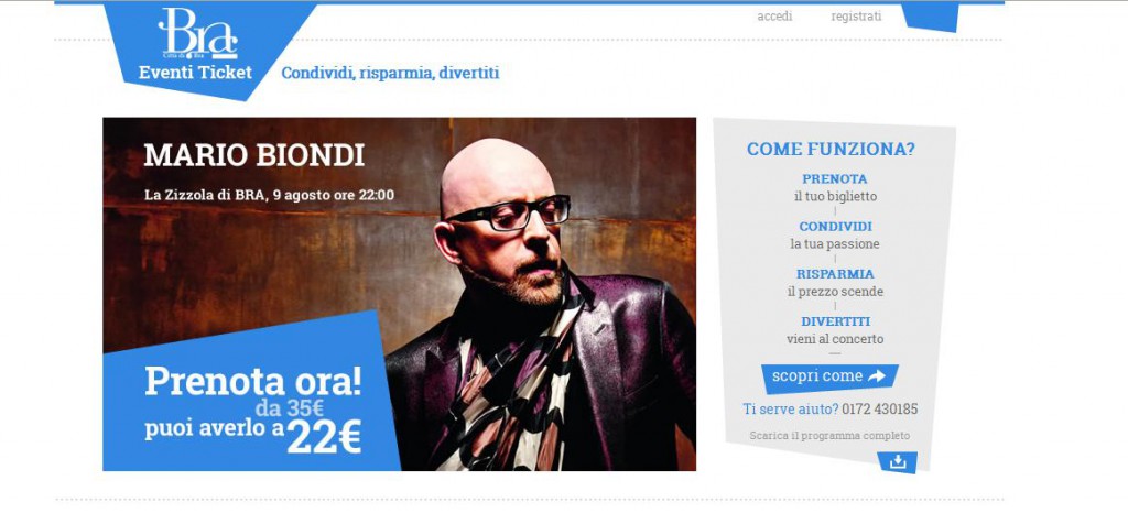 Quando si dice “la necessità aguzza l’ingegno”. Al via da Bra (Cn), culla del movimento Slow Food, la prima sperimentazione a livello nazionale di un nuovo sistema di vendita dei biglietti dei concerti che trae ispirazione dalla logica del social shopping, per la prima volta applicata al mercato musicale. Dal 19 luglio al 23 agosto, nell’ambito del festival “Folkestate”, sarà possibile assistere ai concerti di Francesco De Gregori (19 luglio), Gian Maria Testa (25 luglio), Mario Biondi (9 agosto) e Daniele Silvestri (23 agosto), acquistando un biglietto il cui costo progressivamente scende all’aumentare dei partecipanti.