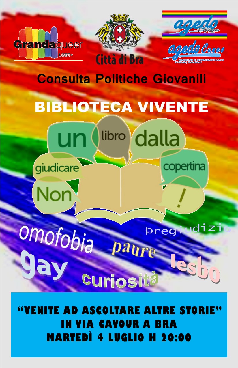La Consulta Politiche Giovanili di Bra, in collaborazione con il Comune di Bra e le associazioni GrandaQueer Cuneo, Agedo Cuneo e Agedo Alba, organizza una serata di sensibilizzazione sul tema dell’omosessualità e delle sue sfaccettature. Martedì 4 luglio 2017, dalle 20, in via Cavour ci sarà un momento di riflessione e condivisione, attraverso una biblioteca vivente con protagonisti che racconteranno il loro vissuto e le loro sensazioni, a chiunque voglia fermarsi per ascoltarli o porgere delle domande.