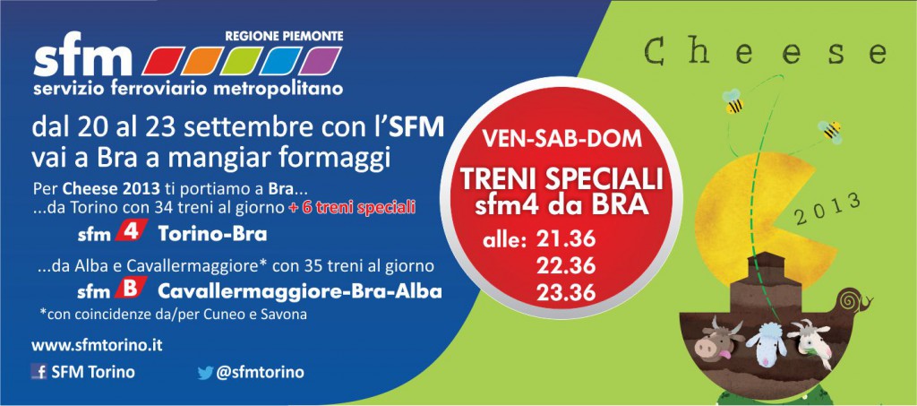 Tutto pronto a Bra per alzare il sipario sull’edizione 2013 di “Cheese – Le forme del latte”, il grande evento dedicato all’enogastronomia in programma nella città della Zizzola dal 20 al 23 settembre 2013. Per l’occasione, l’assessorato ai trasporti della Regione Piemonte e l’Agenzia per la mobilità metropolitana di Torino hanno potenziato le corse serali della linea SFM4 Torino-Bra tra venerdì 20 e domenica 22 settembre.