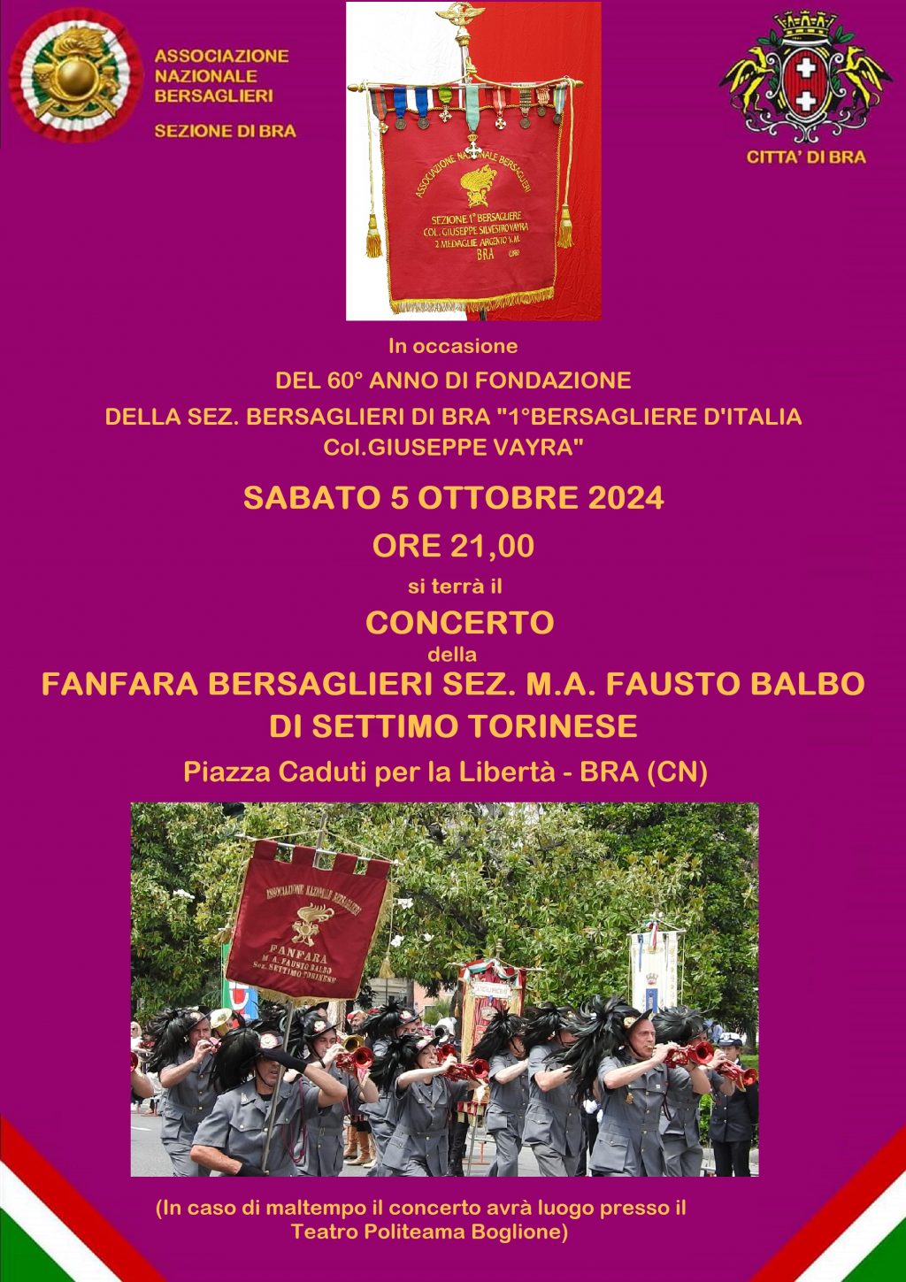 In occasione del 60^ anno di fondazione della sezione Bersaglieri di Bra, sabato 5 ottobre alle ore 21 in piazza CAduti per la Libertà si terrà il concerto della Fanfara Bersaglieri “M.A. Fausto Balbo” di Settimo Torinese.