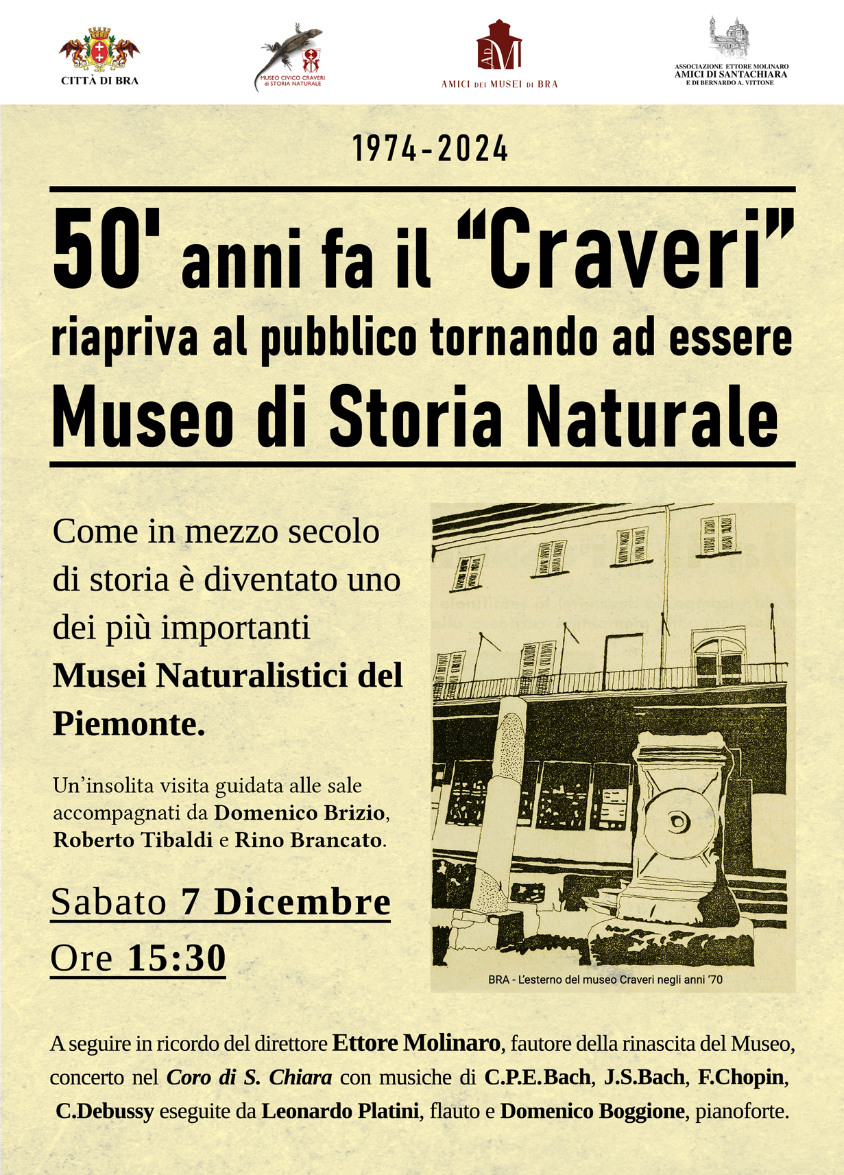 Sabato 7 dicembre 2024, a partire dalle 15.30, verrà celebrato l’importante anniversario della rifondazione del Museo civico con una speciale visita guidata alle sale accompagnati da Domenico Brizio, Roberto Tibaldi e Rino Brancato che illustreranno come, in mezzo secolo di storia, il “Craveri” sia diventato oggi uno dei più importanti Musei Naturalistici del Piemonte.