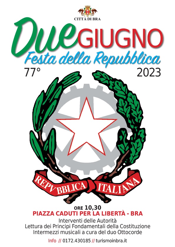 Venerdì 2 giugno 2023 anche la città di Bra celebrerà la 77° Festa della Repubblica Italiana, nata nel 1946 all’indomani del referendum istituzionale con cui i cittadini vennero chiamati alle urne per decidere quale forma di Stato dare al paese. Come da tradizione, in piazza Caduti per la Libertà, a partire dalle 10,30, si terrà una cerimonia pubblica con l’intervento delle Autorità e la lettura dei Principi fondamentali della Costituzione italiana, con intermezzi musicali a cura del duo “Otto corde”.