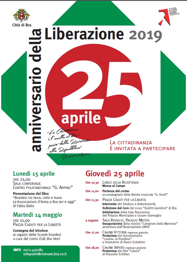 Giovedì 25 Aprile 2019 la Città di Bra celebra l’anniversario della Liberazione del territorio italiano dall’occupazione nazi-fascista con diversi appuntamenti in programma. Alle 10,30, come di consueto, sarà celebrata la Messa al campo in Largo della Resistenza. A seguire, il corteo dei partecipanti accompagnato dalla banda musicale “Giuseppe Verdi” si snoderà per le vie del centro per raggiungere piazza Caduti della Libertà dove, intorno alle 11,30, prenderanno la parola il sindaco di Bra, Bruna Sibille e le autorità presenti. Dopo l’esibizione del Coro del Liceo “Giolitti-Gandino” di Bra si terrà la cerimonia di intitolazione della Sala Resistenza, situata al piano terra del palazzo municipale, a Cesare Gramaglia (1920-1999), sindaco di Bra tra il 1979 e il 1980, per molti anni assessore e consigliere comunale. Giovane partigiano, Gramaglia, con lo pseudonimo di “comandante Neri” era stato alla guida del distaccamento di Santa Vittoria, suo paese d’origine, e vicecomandante della XII divisione Autonoma Bra di cui il distaccamento faceva parte. Nei giorni della Liberazione, fu il primo partigiano ad entrare nel municipio di Bra e successivamente gli fu affidato dal Cln l’incarico di “comandante di piazza” a Carmagnola. Iscritto al partito socialista, affiancò per tutta la vita la passione politica al mestiere di maestro elementare e in qualità di assessore si occupò di lavori pubblici e urbanistica. Alla cerimonia interverrà il figlio Umberto con alcuni familiari.