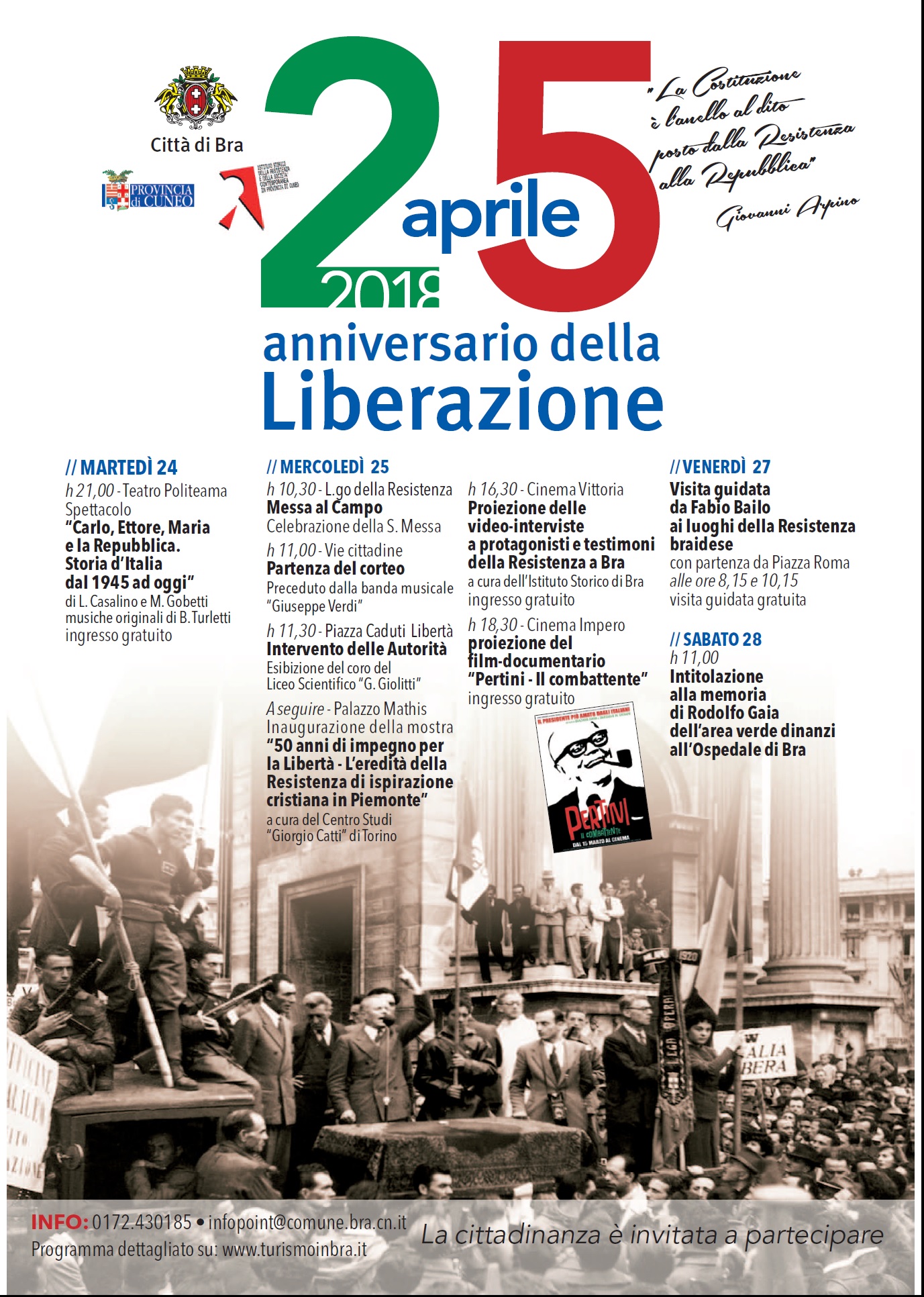 Nel 73esimo anniversario della Liberazione del territorio italiano dall’occupazione nazifascista, l’Amministrazione comunale di Bra promuove un ricco programma di iniziative rivolte alla cittadinanza.