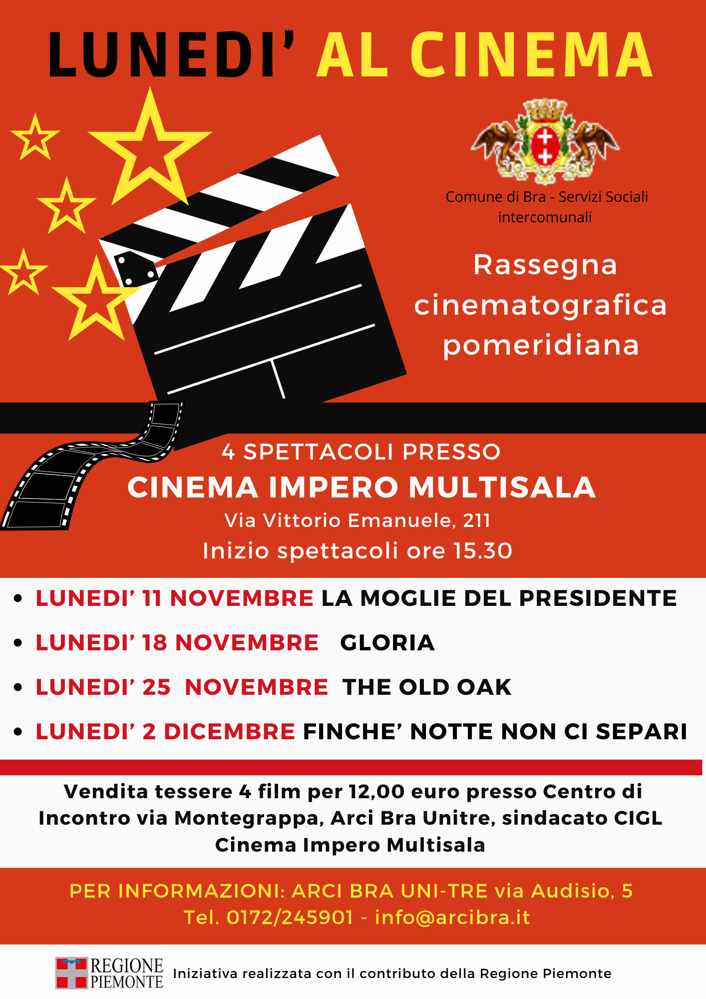 La tessera di abbonamento ai 4 film è in vendita presso il Centro di Incontro di via Montegrappa, l’Arci Unitre, l’organizzazione sindacale Cgil, o direttamente al cinema Impero prima delle proiezioni. Maggiori informazioni presso l’Arci Bra, via Audisio 5, tel. 0172-245901.