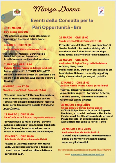 In Italia il tema della disparità di genere continua ad essere sempre molto attuale e purtroppo le cronache nazionali riportano con frequenza casi di violenza sulle donne. Acquista quindi una rilevanza ancor più marcata un articolato momento di riflessione come “Marzo Donna”, programma di iniziative che anche quest’anno Comune di Bra e Consulta Pari Opportunità organizzano con l’intento di spingere le persone a riflettere sul problema e a contribuire al superamento di un retaggio culturale sbagliato.
