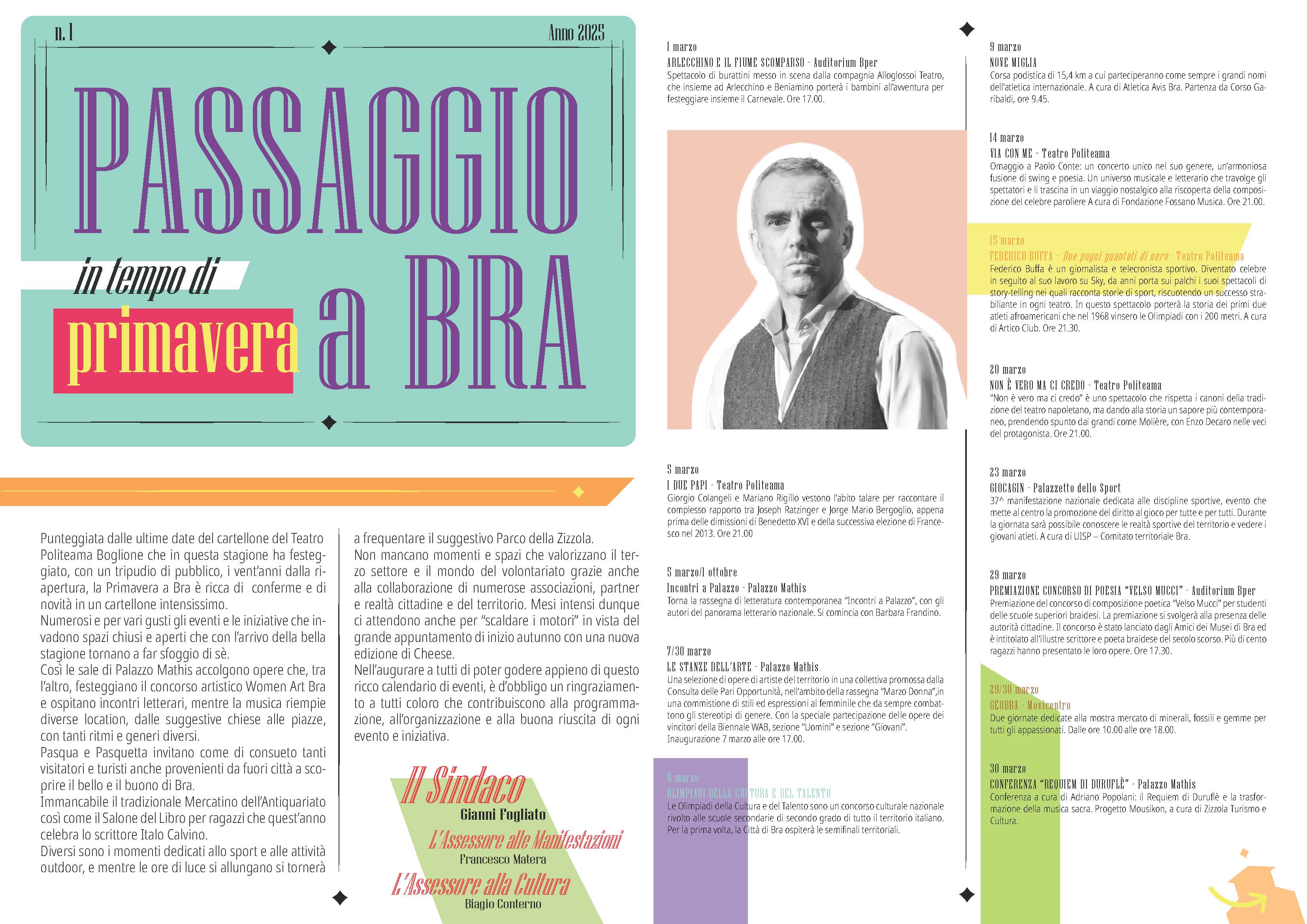 Ma il programma del Passaggio a Bra in tempo di primavere prevede ancora tanti momenti dedicati ai temi più vari: lo spettacolo di story-telling di Federico Buffa proposto da Artico Club, la premiazione del concorso di composizione poetica “Velso Mucci”, GeoBra, la due-giorni al Movicentro dedicata alla mostra mercato di minerali, la Conferenza di Adriano Popolani sul “Requiem di Duruflè” organizzata da Zizzola Turismo e Cultura, lo spettacolo Catalano vs Bukowski, nonché la conferenza del prof. Adalberto Bianchi sul “Funzionamento del comune di Bra nel secolo XIV. Le famiglie predominanti”, che consentirà di fare un tuffo nella storia millenaria della nostra città. Questo e tanto altro.