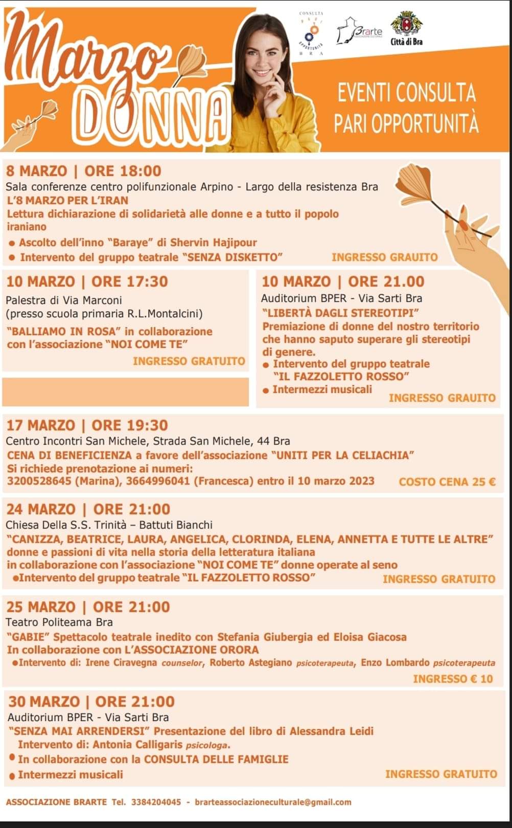 Anche quest’anno il Comune di Bra e la Consulta Pari Opportunità, in collaborazione con l’Associazione Brarte, organizzano “Marzo Donna”, ricco calendario di appuntamenti per celebrare la Giornata internazionale della donna che ricorre l’8 marzo. Un’occasione per ribadire la parità tra i generi e denunciare le discriminazioni e le violenze di cui le donne sono state e sono ancora oggetto.