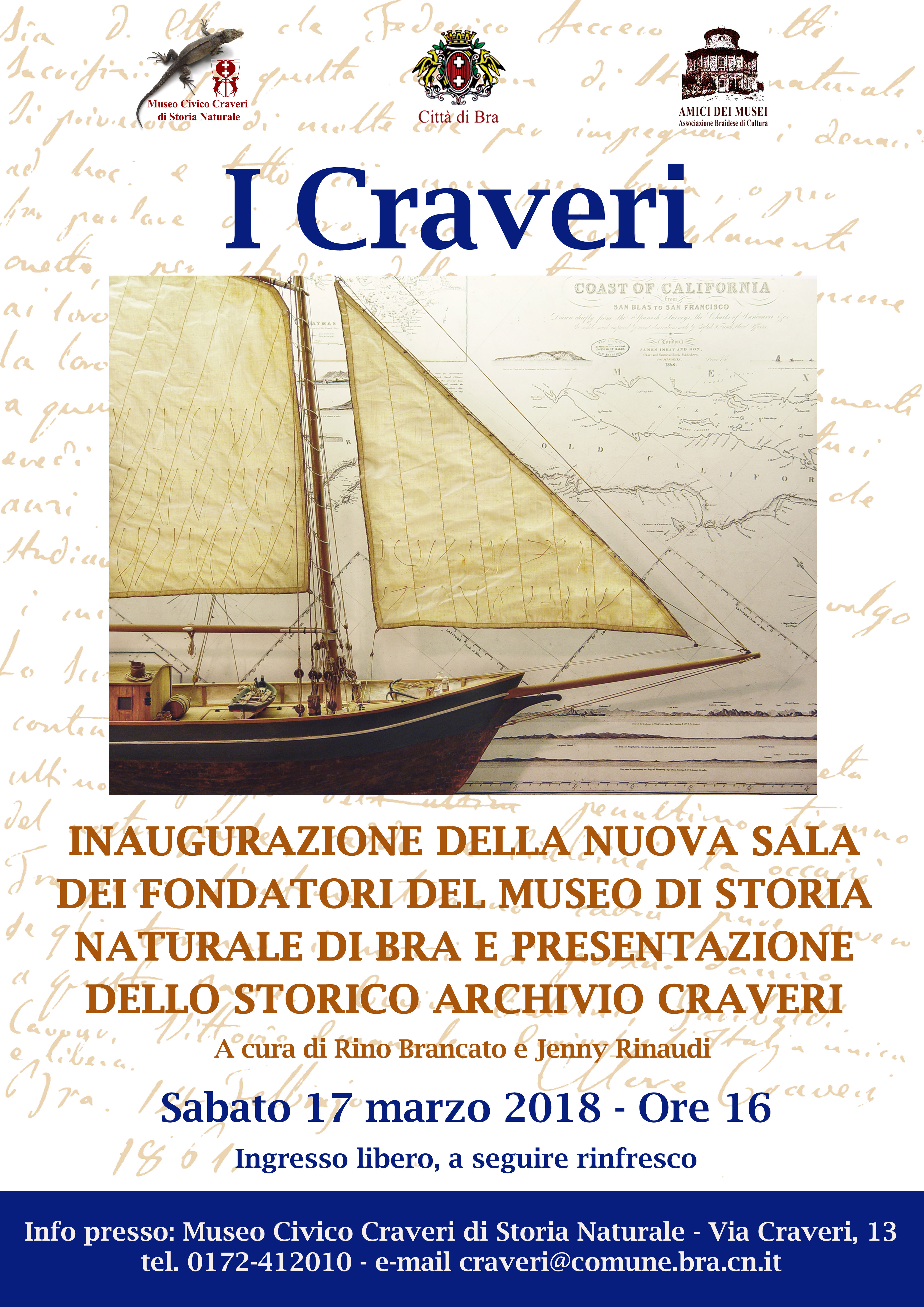 Sarà inaugurata sabato 17 marzo 2018 alle 16 (anziché sabato 3 marzo come precedentemente stabilito) la nuova “Sala dei fondatori” del Museo di Storia Naturale di Bra, nato dalla collezione privata di metà ‘800 dell’avvocato braidese Angelo Craveri e arricchito dai reperti raccolti dai suoi figli, Ettore e Federico, ricercatori e studiosi che posero le basi per il museo poi diventato patrimonio del Comune. La presentazione, a cura di Rino Brancato e Jenny Rinaudi, del rinnovato allestimento che ricorda i personaggi a cui si deve la nascita della raccolta braidese, tra le più importanti sul territorio regionale, sarà anche occasione per illustrare, il lavoro di trascrizione e riorganizzazione dello Storico Archivio Craveri, avviato da Padre Ettore Molinaro negli anni Novanta e continuato da alcuni appassionati collaboratori negli anni successivi e fino ad oggi.