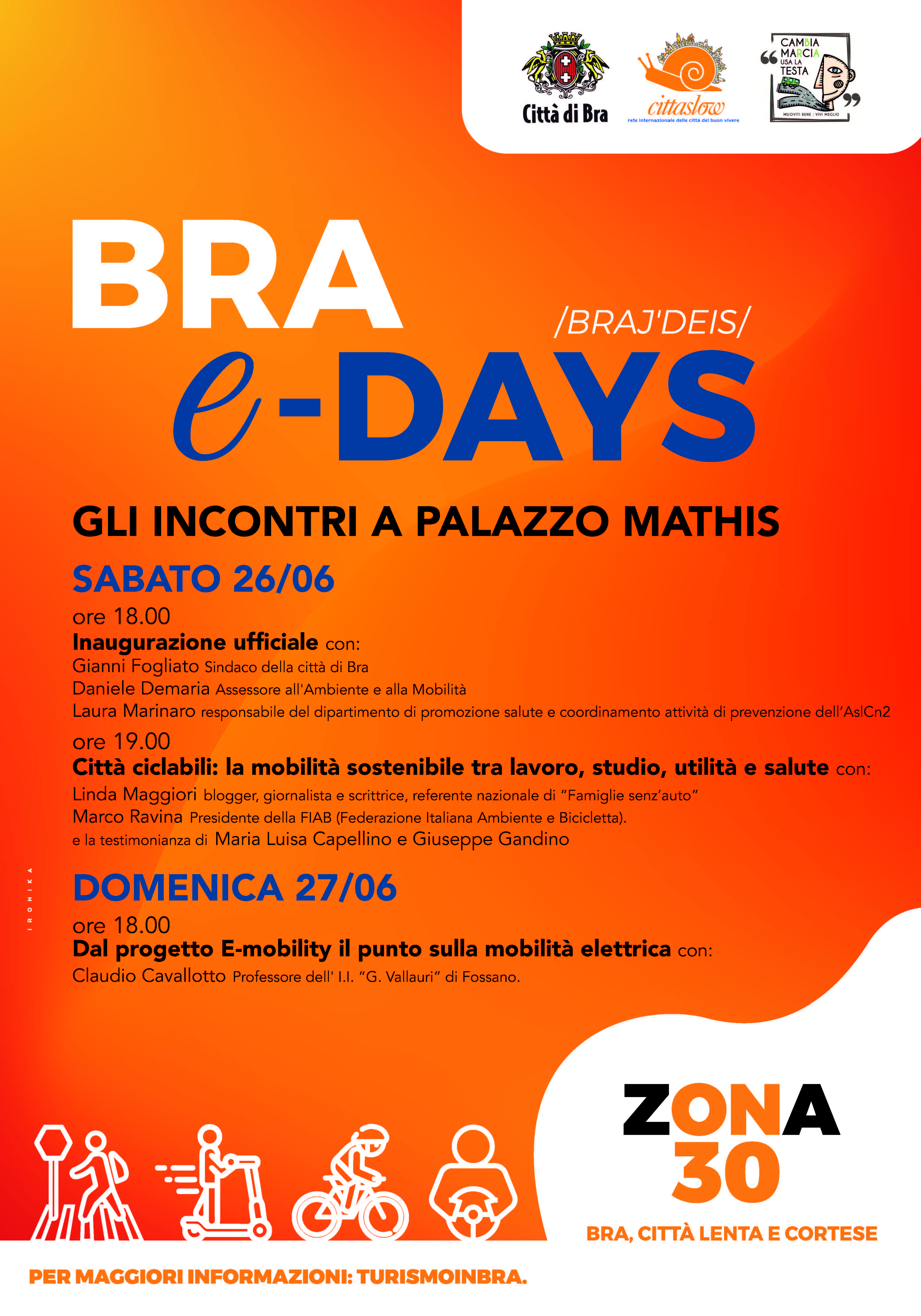 Nel pomeriggio, a partire dalle 18, nel cortile di Palazzo Mathis interverrà il prof. Claudio Cavallotto con alcuni studenti dell’istituto Vallauri di Fossano per sciogliere i dubbi e confutare le tante fake news che circolano sul tema della mobilità elettrica illustrando i reali sviluppi del settore. Tutti gli incontri del week end sono a ingresso libero fino ad esaurimento posti, si consiglia la prenotazione presso l’Ufficio Cultura e Manifestazioni del Comune chiamando lo 0172-430185 o scrivendo a turismo@comune.bra.cn.it.