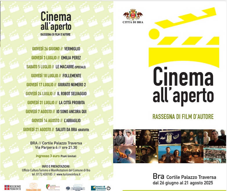 Il 10 luglio è la volta di Follemente, divertente commedia diretta da Paolo Genovese, mentre il 17 luglio va in scena Giurato numero 2, film diretto da Clint Eastwood che porta in scena il grave dilemma morale con cui si trova alle prese un giurato di un processo per omicidio. Il 24 luglio si proietta la pellicola di animazione Il Robot selvaggio, mentre il 31 luglio è dedicato a La Città proibita di Gabriele Mainetti. Si prosegue il 7 agosto con Io sono ancora qui di Walter Salles, che racconta un Brasile nella morsa della dittatura militare a inizio anni 70, il 14 agosto con L’abbaglio, film storico di Roberto Andò con Toni Servillo, per concludere giovedì 21 agosto con il documentario “Saluti da Bra. Storie di emigrazione italiana” diretto da Remo Schellino, in un appuntamento gratuito che, tramite le storie di una ventina di uomini e donne, traccia un ritratto corale dei flussi migratori che raggiunsero la città della Zizzola alcuni decenni fa.