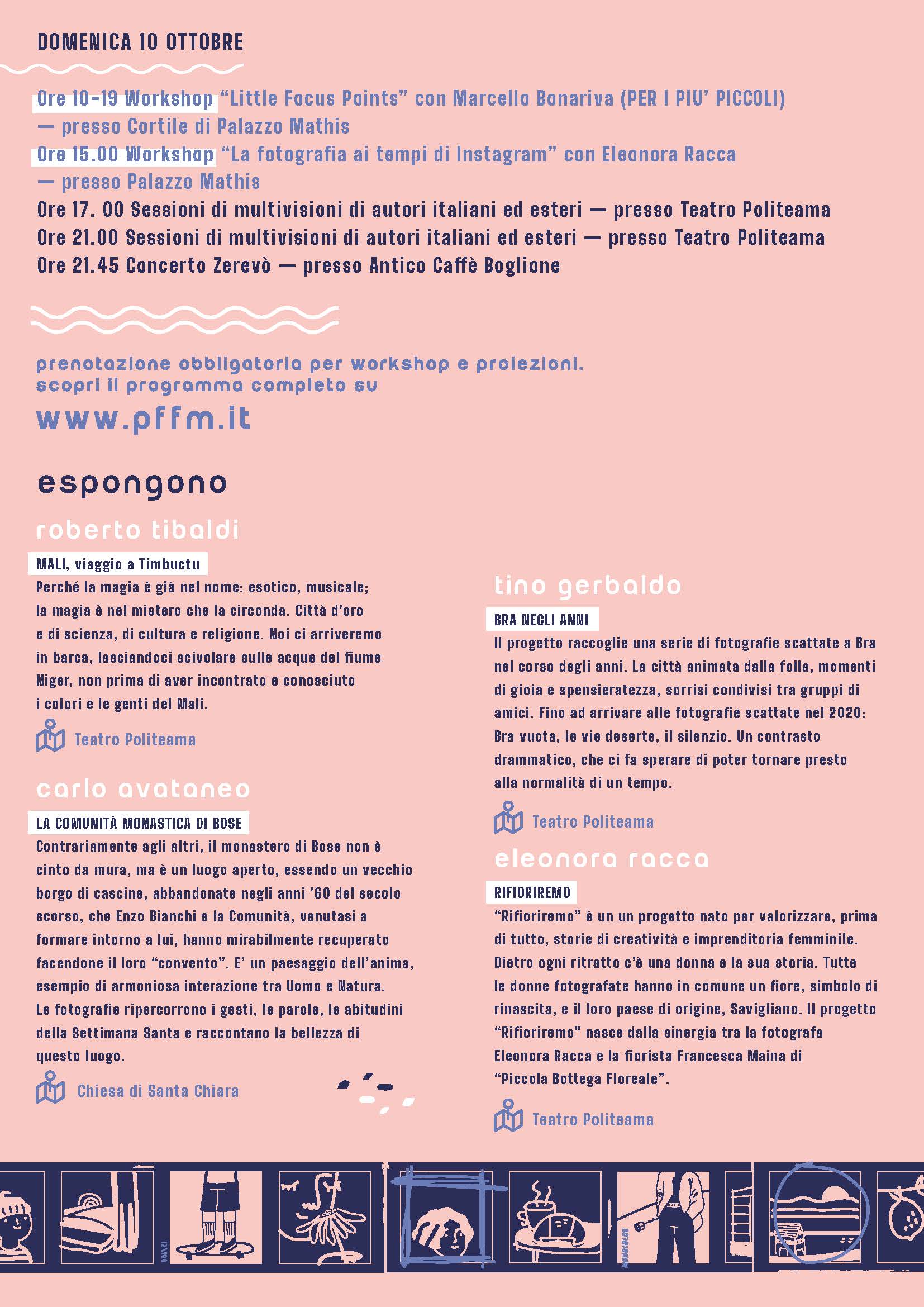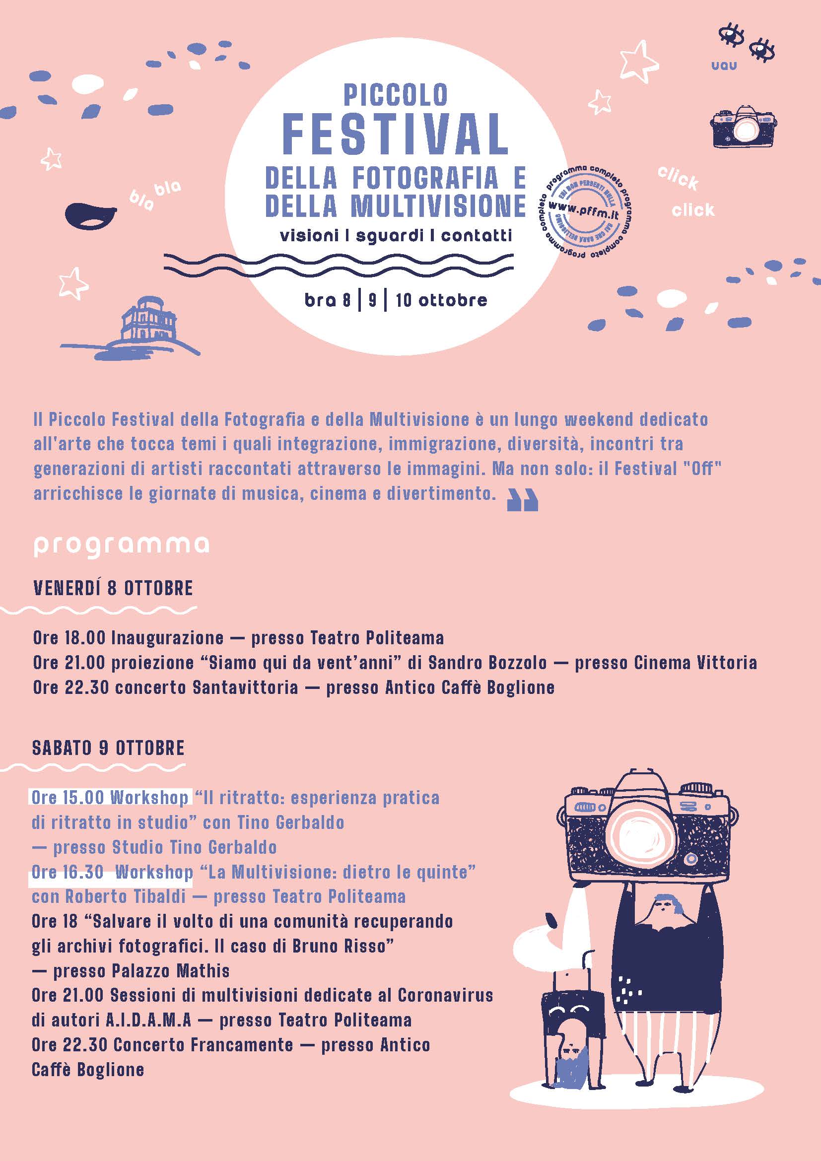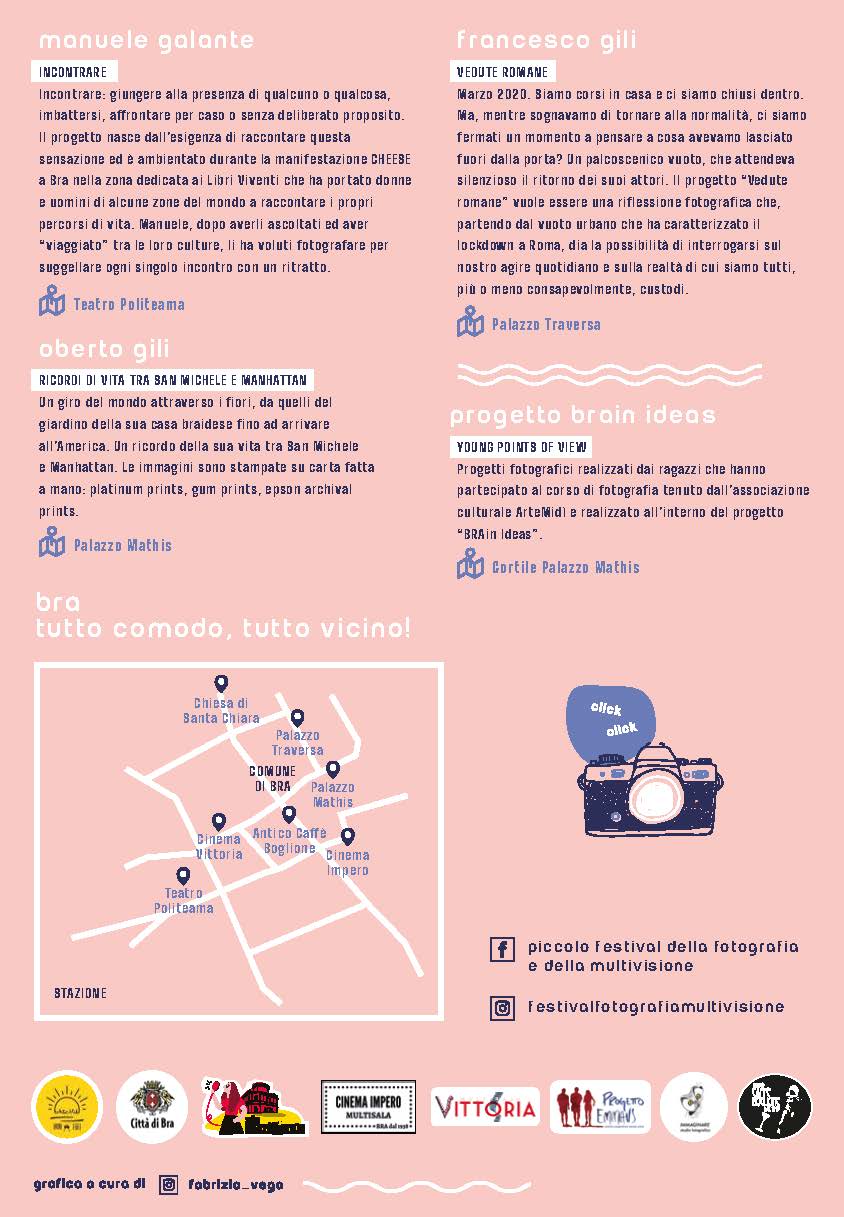 Durante le giornate del festival si alterneranno interviste ai fotografi protagonisti, workshop e proiezioni. Una parte del festival, curata dal fotografo braidese Roberto Tibaldi, sarà dedicata alla multivisione, per cui saranno presenti ospiti internazionali. La parte “off” del Festival sarà caratterizzata da cinema e musica. Sandro Bozzolo, giovane regista del territorio, presenterà al Cinema Vittoria il documentario “Siamo qui da vent’anni”. Durante le tre giornate, si alterneranno musicisti braidesi e torinesi: Davide Viberti, Francesca Siano (Francamente) e il gruppo degli Zerevò; i concerti si terranno presso l’Antico Caffè Boglione.