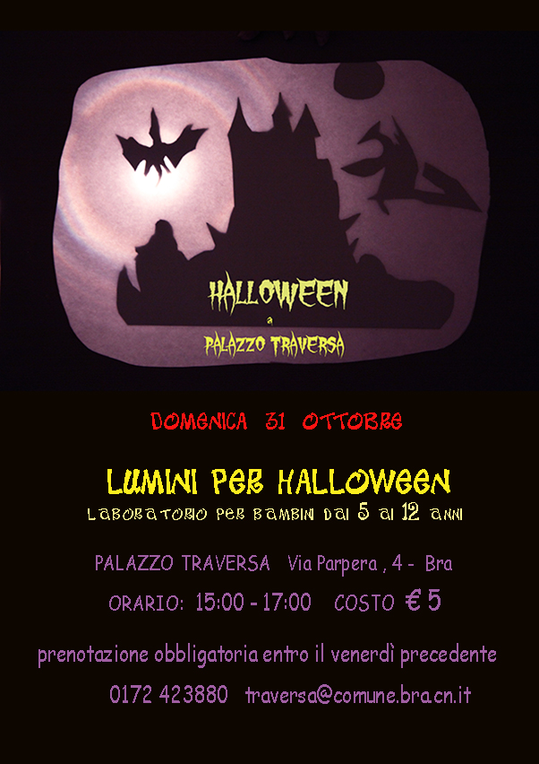 Al Museo archeologico di Palazzo Traversa si svolgerà invece il laboratorio dedicato ai bambini dai 5 ai 12 anni “Lumini per Halloween” (orario 15-17). I piccoli partecipanti verranno guidati nella realizzazione del proprio lume da utilizzare per rischiarare la notte più tenebrosa dell’anno. Il costo è di 5 euro a bambino. Posti limitati, prenotazione obbligatoria entro il venerdì mattina precedente chiamando lo 0172-423880 o scrivendo a traversa@comune.bra.cn.it.