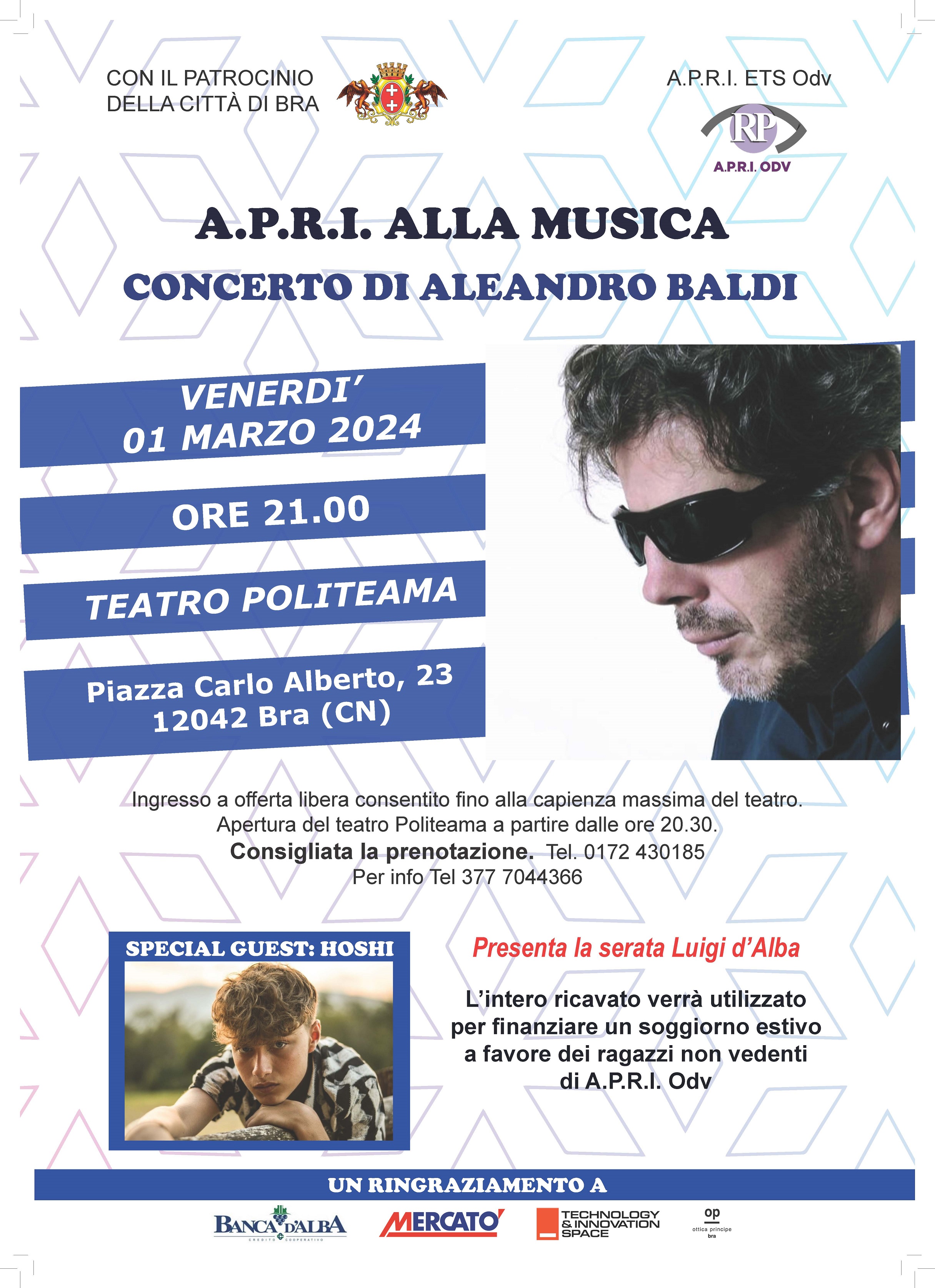 Il cantautore toscano Aleandro Baldi si esibirà in Piemonte allo scopo di sostenere ed aiutare le attività benefiche portate avanti dall’Associazione Pro retinopatici e Ipovedenti (A.P.R.I.-odv). Nella mini tournèe è previsto anche un concerto presso il Teatro Politeama di Bra. L’evento, patrocinato dal comune, si svolgerà venerdì 1 marzo 2024 alle ore 21. Introdurrà la serata la giovane voce emergente Hoshi. Presenterà Luigi d’Alba. Ingresso a offerta libera. Consigliata la prenotazione telefonando al n. 0172-430185.