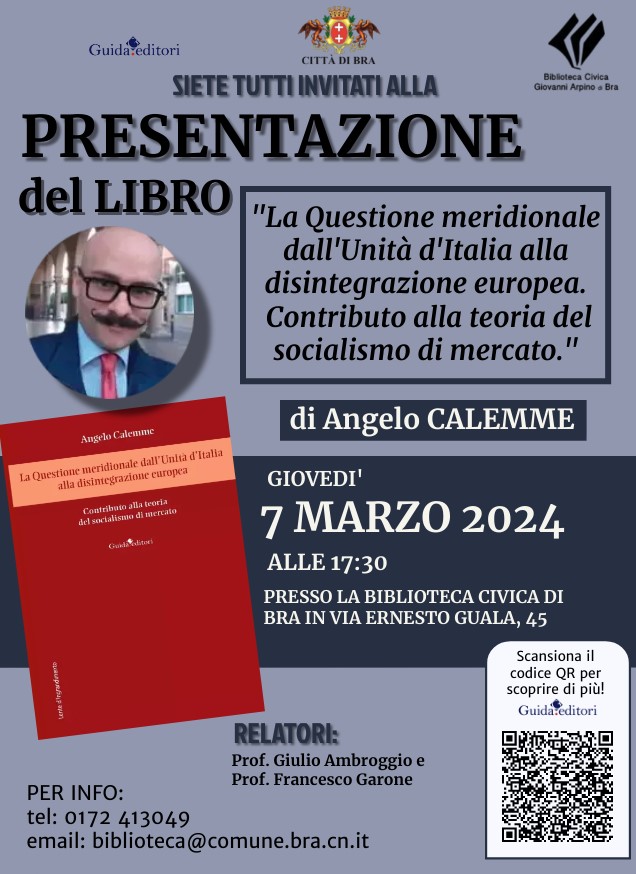 Nel pomeriggio di giovedì 7 marzo 2024 la biblioteca “Giovanni Arpino” di Bra ospita la presentazione del nuovo libro di Angelo Calemme “La Questione meridionale dall’Unità d’Italia alla disintegrazione europea. Contributo alla teoria del socialismo di mercato” (Guida editore). Si tratta di saggio di carattere monografico incentrato sulla Questione meridionale, in generale dall’unificazione italiana all’unificazione europea.