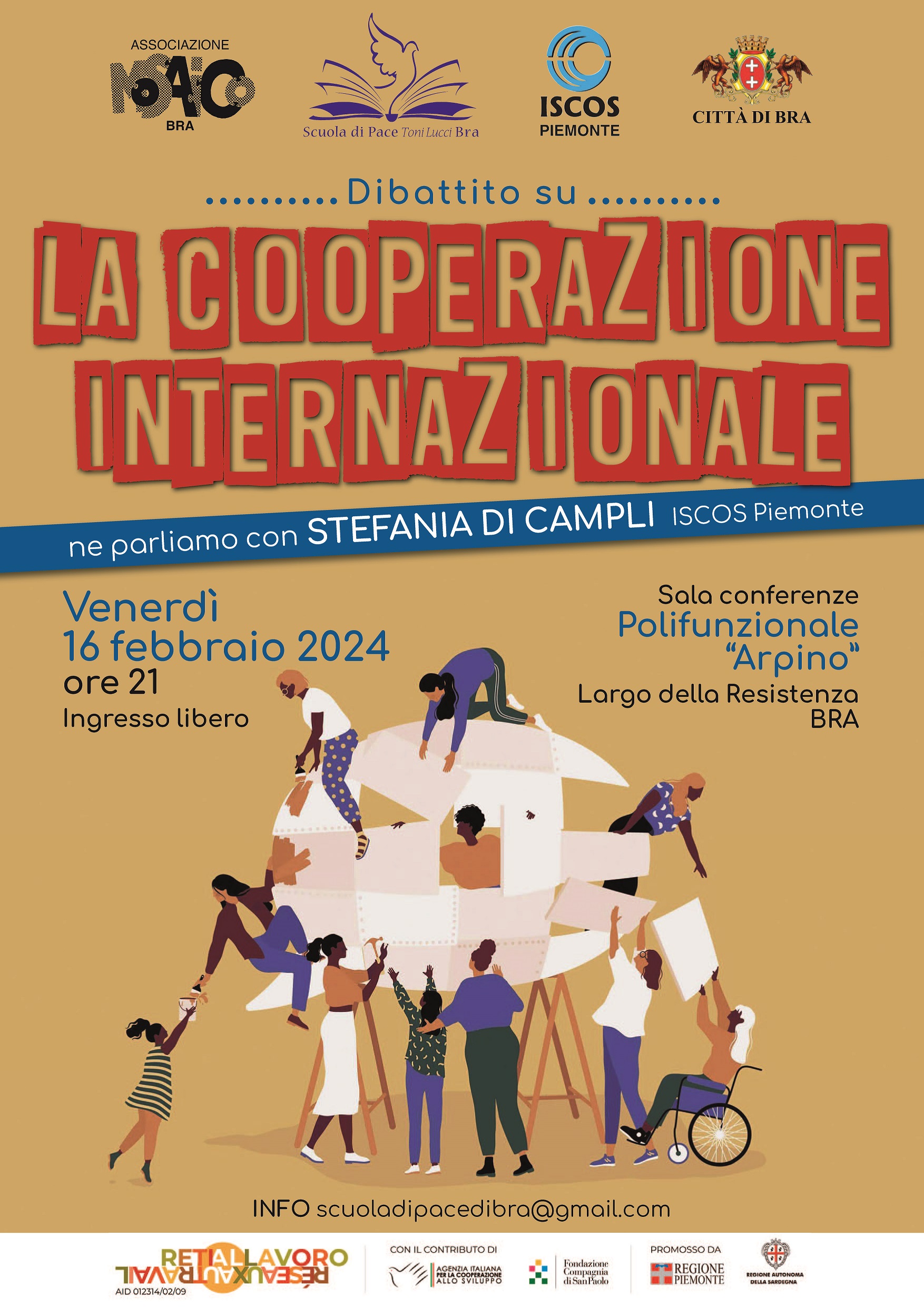 La Scuola di Pace “Toni Lucci” di Bra organizza per venerdì 16 febbraio 2024 (a partire dalle 21) un momento pubblico di confronto e di dibattito sul tema de “La cooperazione internazionale”. L’appuntamento, ad ingresso gratuito, si svolgerà presso la sala conferenze del centro polifunzionale “Giovanni Arpino”, in largo della Resistenza.