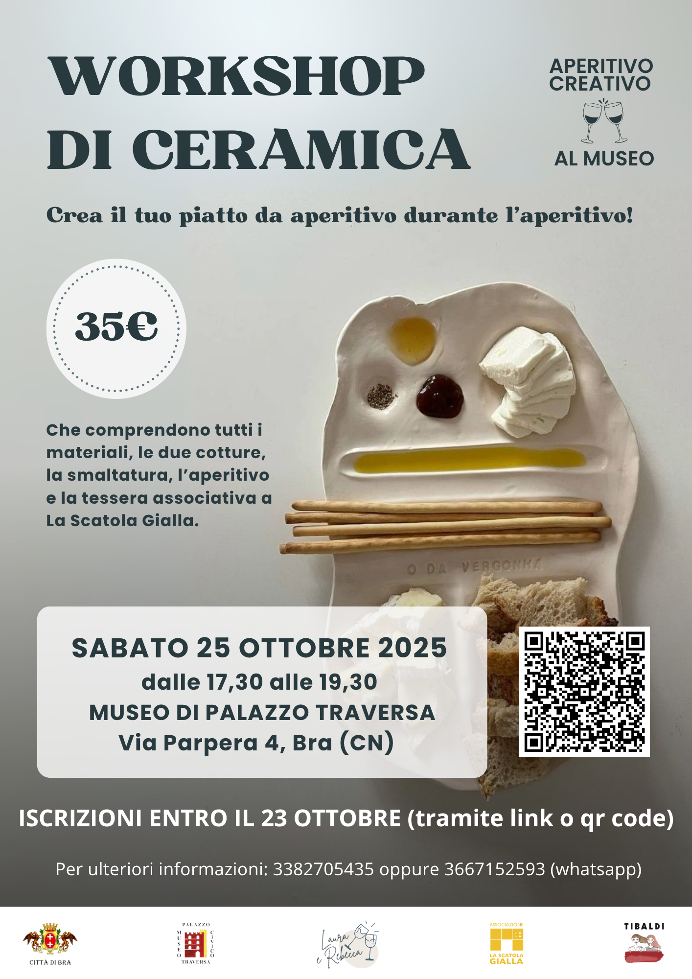 Il Museo civico di archeologia, storia arte di Palazzo Traversa propone un aperitivo creativo al museo: un evento esclusivo che unisce il piacere di un raffinato aperitivo con il fascino della creazione artistica, in un luogo ricco di storia e bellezza. L’appuntamento, in programma per sabato 25 ottobre 2025 dalle 17,30 alle 19,30, prevede un workshop di ceramica che consentirà ai partecipanti di realizzare personalmente un originale piatto da aperitivo che si potrà ritirare, in seguito alla cottura, dopo un paio di settimane. L’esperienza creativa si alternerà a momenti di convivialità in cui gustare un delizioso aperitivo immersi tra le opere d’arte.