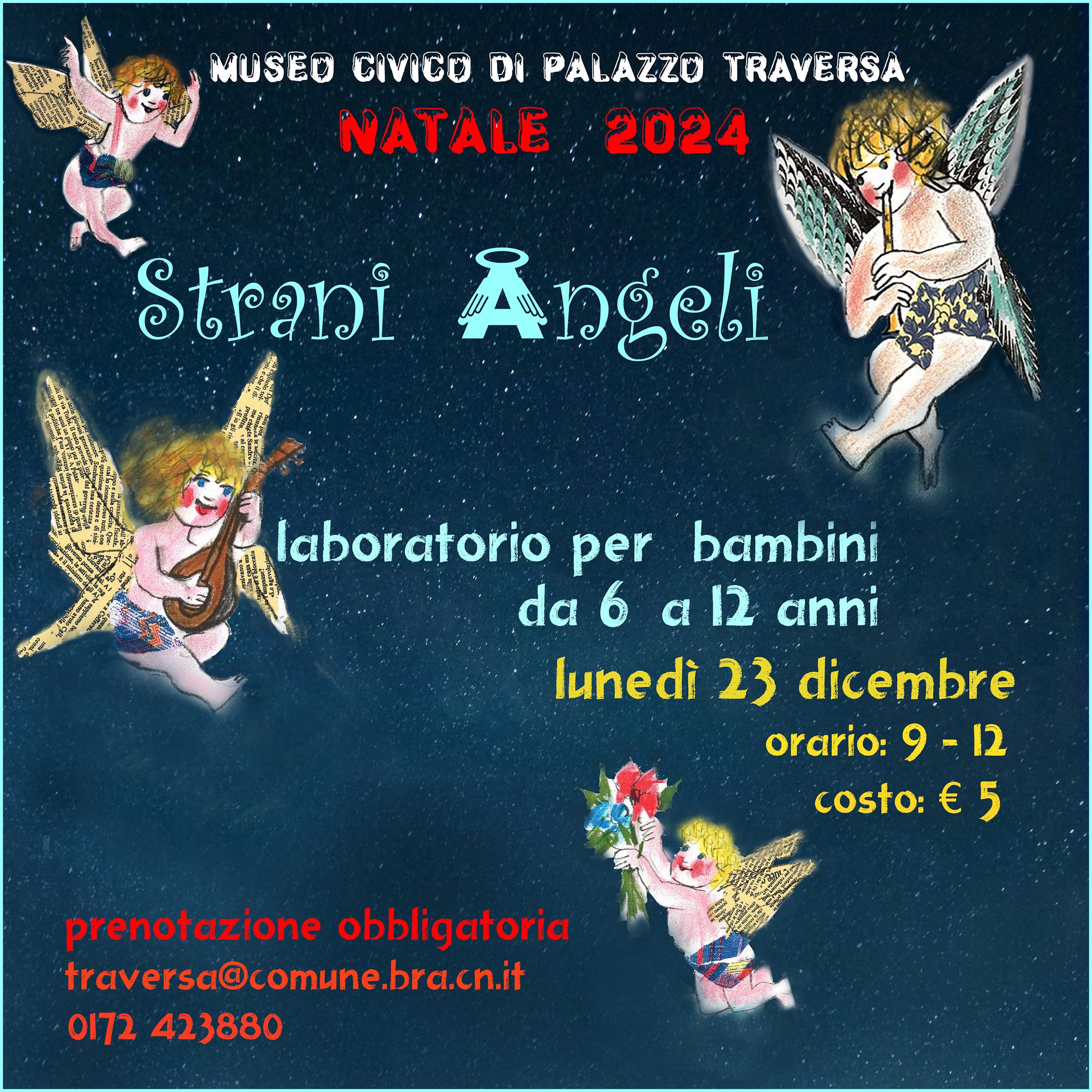 Lunedì 23 dicembre sarà invece la volta di “Strani angeli”, laboratorio per creare decorazioni natalizie ispirate alle figure di angeli, raffigurate da vari artisti nel corso del tempo. Ognuno potrà personalizzare i propri angeli per renderli davvero unici. L’appuntamento creativo è in programma dalle 9 alle 12, al costo di 5 euro a bambino/a. Anche in questo caso, è necessario prenotarsi scrivendo a traversa@comune.bra.cn.it o chiamando in museo al numero 0172.423880.