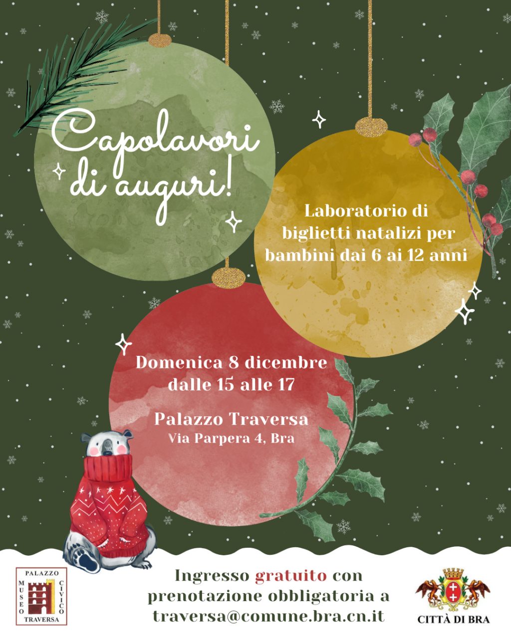 Il primo appuntamento è “Capolavori di auguri! Biglietti natalizi tra arte e creatività”, in programma domenica 8 dicembre dalle 15 alle 17. Un pomeriggio dedicato alla realizzazione di bigliettini di auguri: i partecipanti sperimenteranno tecniche e materiali differenti, liberando la propria creatività. Partecipazione gratuita, con prenotazione obbligatoria alla mail: traversa@comune.bra.cn.it o al numero 0172.423880.
