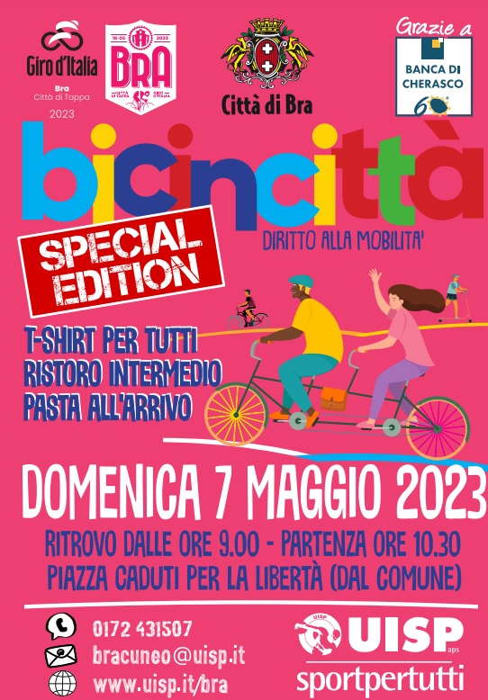 Si terrà domenica 7 maggio “Bicincittà Special Edition” pedalata promossa dalla Uisp in collaborazione con la Città di Bra. L’iniziativa si inserisce nel ricco calendario di eventi organizzati in città in vista della tappa Bra – Rivoli del Giro d’Italia del 18 maggio.