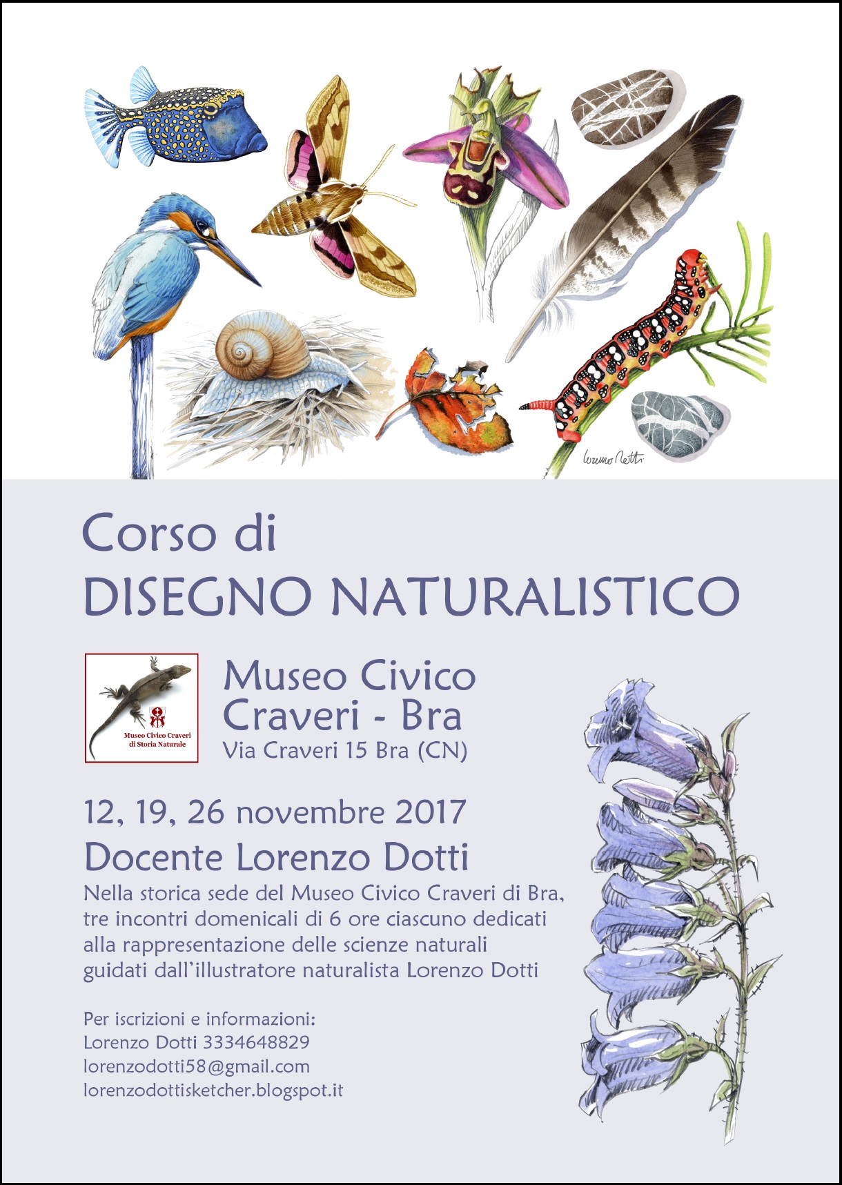 Tre incontri dedicati alla rappresentazione del mondo naturale con la guida dell’illustratore e acquerellista Lorenzo Dotti, già docente di Disegno Naturalistico per il Corso di Laurea in Conservazione dei Beni culturali e ambientali all’Università “Suor Orsola Benincasa” di Napoli. Saranno le sale ricche di storia del museo civico di storia naturale “Craveri” a ospitare, nel mese di novembre, la nuova edizione del corso di disegno naturalistico. Durante le lezioni in programma nelle domenica 12, 19 e 26 novembre 2017, i partecipanti saranno guidati nella riproduzione dal vivo di elementi naturali, spaziando tra le varie collezioni di uccelli, invertebrati, anfibi, rettili, mammiferi e molluschi, secondo le tecniche dell’acquerello, del disegno al tratto a matita e drawing pen waterproof e delle matite acquerellabili.