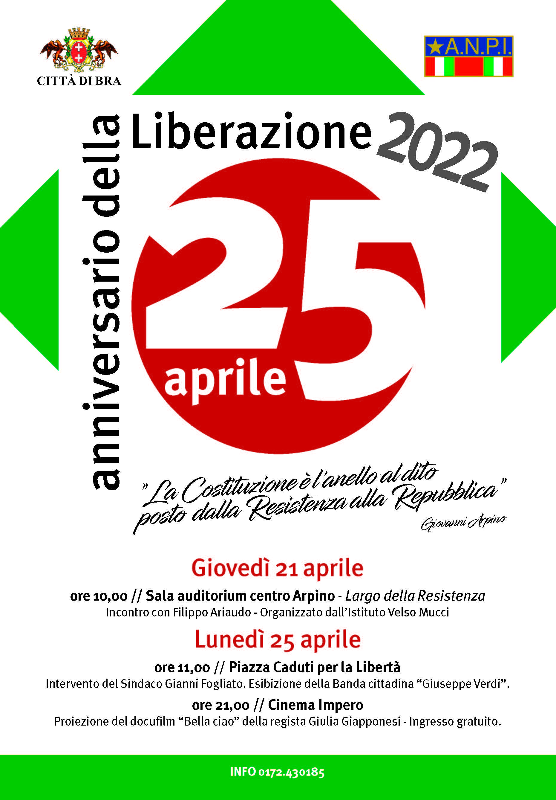 “La Costituzione è l’anello al dito posto dalla Resistenza alla Repubblica”. Le parole di Giovanni Arpino inaugurano il calendario di iniziative organizzate dalla Città di Bra in occasione del 77esimo anniversario della Liberazione del territorio italiano dall’occupazione nazi-fascista.