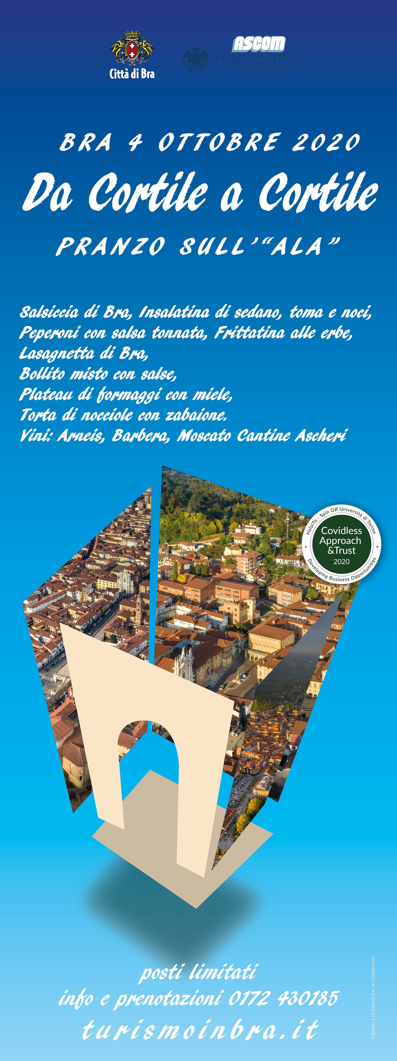 Si comincia con la nuova edizione di “Da Cortile a Cortile”, appuntamento storico dell’autunno braidese che quest’anno, causa la necessità di rispettare le prescrizioni anti-Covid, andrà in scena in una forma innovativa. Sopra l’ala di corso Garibaldi verrà allestito una ampio ristorante all’aperto in cui si potranno gustare tante prelibatezze. Il menu prevede: salsiccia di Bra, insalatina di sedano, toma e noci, peperoni con salsa tonnata, frittatina alle erbe, lasagnetta di Bra, bollito miste con salse, plateau di formaggi con miele, torta di nocciole con zabaione. Il costo è di 25 euro, che scende a 20 euro per i gruppi con più di 15 persone. Visto il numero limitato di posti disponibili è necessario prenotare chiamando lo 0172.430185 o scrivendo a turismo@comune.bra.cn.it.