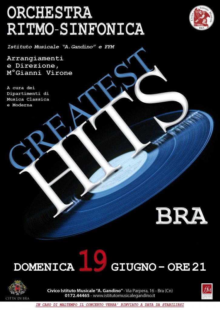 “Greatest hits”, ovvero “Il meglio di sempre”: promette bene il titolo del concerto dell’Orchestra ritmico-sinfonica del civico istituto musicale di Bra “Adolfo Gandino”, in programma per domenica 19 giugno 2016, alle 21 nel cortile della scuola primaria “Montalcini” (anche conosciuta come “le maschili”) di via Vittorio Emanuele II 200.