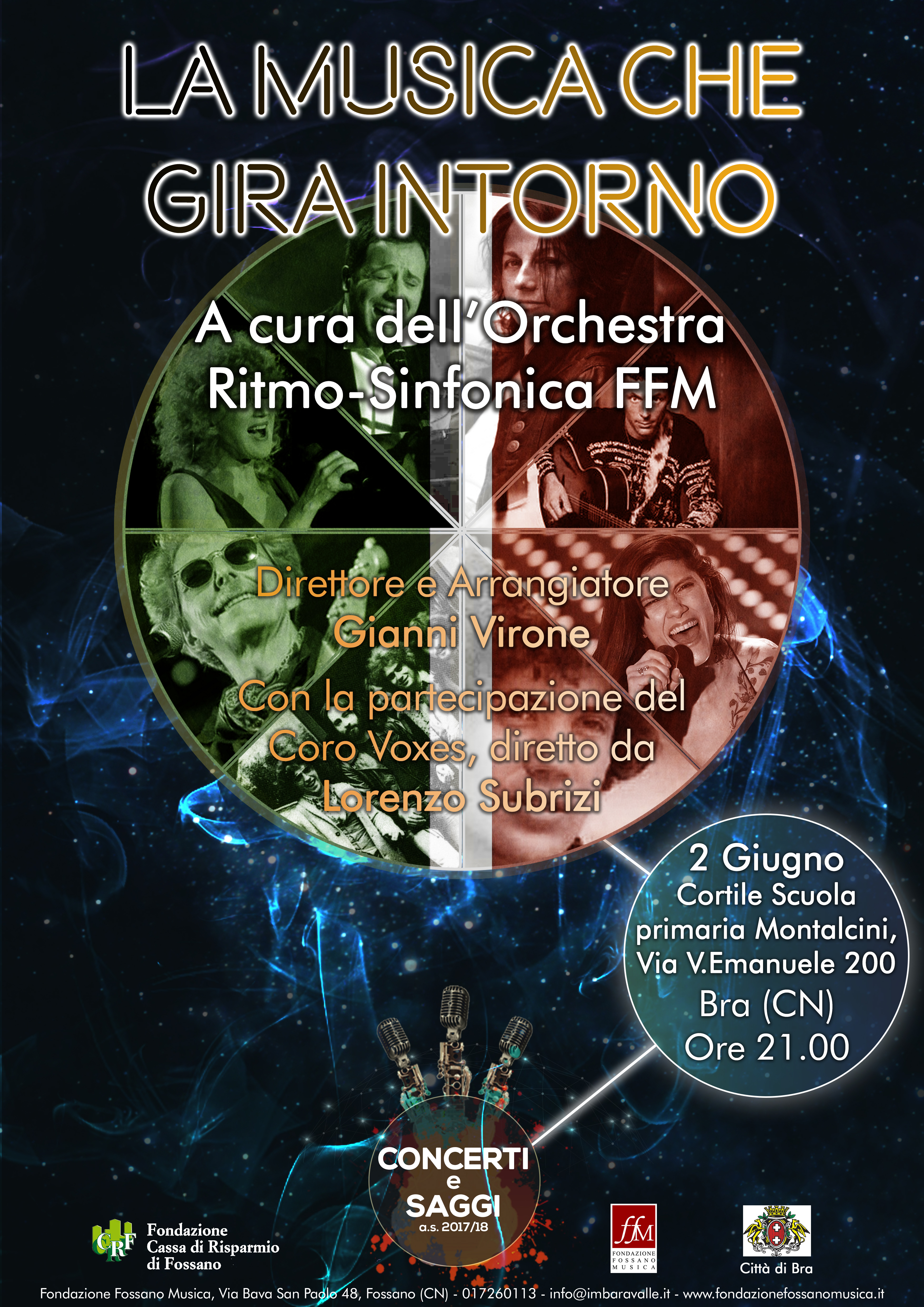 Sabato 2 giugno, sempre nel cortile della “Montalcini”, andrà infine in scena “La musica che gira intorno”, concerto di fine anno dell’istituto braidese dedicato ai successi della canzone italiana. L’appuntamento, che si inserisce nell’ambito delle celebrazioni in occasione della Festa della Repubblica, vedrà protagonista l’Orchestra ritmico-sinfonica della FFM, formata da oltre 100 elementi, che si esibirà – con direzione e arrangiamento a cura di Gianni Virone – insieme ad allievi e docenti dei dipartimenti musicali classico e moderno, a voci soliste e al Coro Voxes diretto da Lorenzo Subrizi, per uno spettacolo indimenticabile.