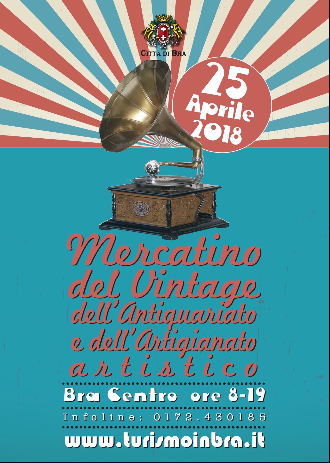Si preannuncia un’edizione da record – con oltre 300 espositori provenienti da Piemonte, Liguria e regioni limitrofe – per il tradizionale mercatino in programma a Bra mercoledì 25 aprile 2018. Le bancarelle di vintage, modernariato, collezionismo e antiquariato minore si snoderanno in via Principi di Piemonte, via Cavour, via Marconi, via Sarti, via Audisio, via Pollenzo e una parte di piazza Roma, a disposizione di curiosi e appassionati per tutta la giornata, a partire dalle 8. Non mancherà una selezione dedicata al vinile e al mondo delle sette note, con sottofondo musicale tematico.