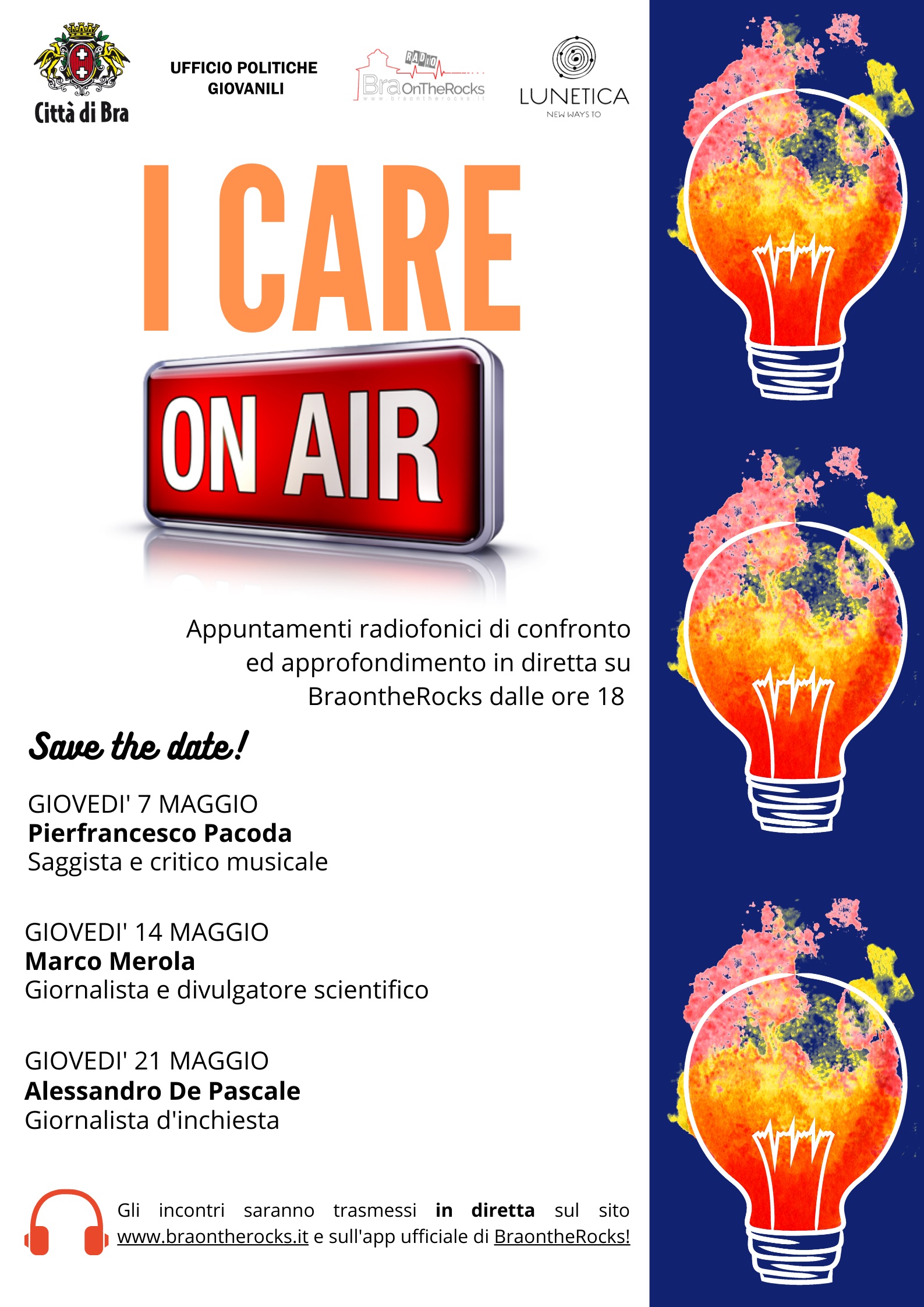 In particolare, ogni relatore realizzerà un breve video che introdurrà il tema che verrà successivamente affrontato durante una diretta radio. Queste “Pillole di I Care” verranno postate sulla pagina Facebook “Politiche giovanili – Bra”, il lunedì che precede l’appuntamento radiofonico. Quindi, per tre giovedì di maggio (il 7, il 14 e il 21 maggio 2020 dalle ore 18) andrà in onda sulla WebRadio BraontheRocks “I Care. On air”, incontri in diretta con i relatori a cui verranno poste alcune domande guida utili ad affrontare il tema per il quale sono stati invitati. Infine gli appuntamenti in radio verranno registrati per permettere il montaggio di un video conclusivo del progetto, così da poter rappresentare un materiale semplice da consultare per chi ne avesse bisogno.