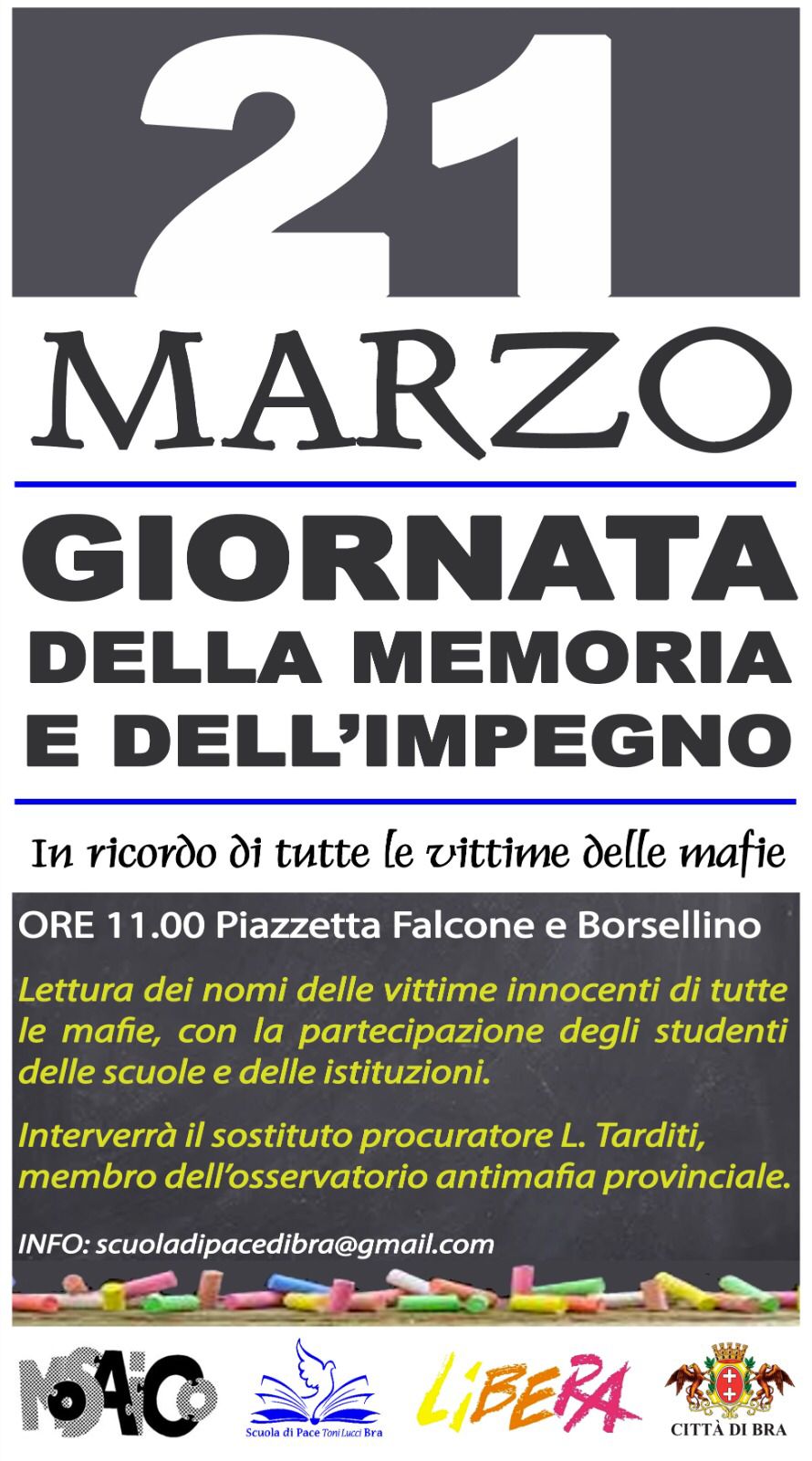 Anche nel 2023 la città di Bra aderisce a questo momento solenne con una cerimonia che si terrà in piazzetta Falcone e Borsellino a partire dalle 11. All’appuntamento, organizzato all’Amministrazione comunale e dalla Scuola di Pace “Toni Lucci”, prenderanno parte gli studenti delle scuole cittadine che si alterneranno a rappresentanti delle istituzioni nella lettura dei nomi degli uomini e delle donne vittime di mafia. Interverrà anche il magistrato Luciano Tarditi, ex sostituto procuratore presso il Tribunale di Asti e membro dell’Osservatorio provinciale antimafia.