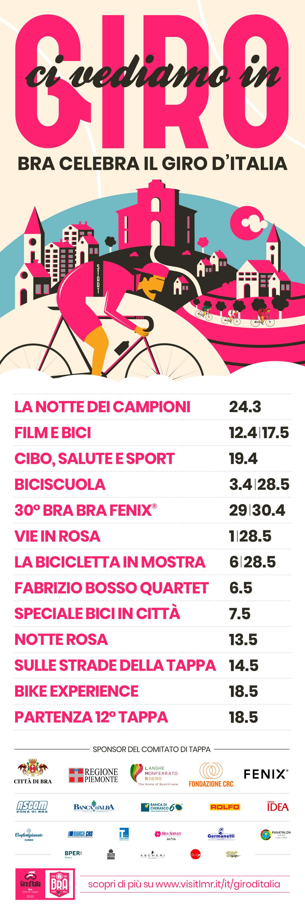 A rendere possibile questo ricco calendario di iniziative il contributo degli sponsor del Comitato di Tappa, ovvero Regione Piemonte, Atl Langhe, Monferrato, Roero, Fondazione Crc, Fenix, Ascom Bra, Banca d’Alba, Banca di Cherasco, Rolfo, Rivista Idea, Confartigianato Cuneo, Banca Crs, Bper, Tesi Square, Bra Servizi, Selmi, Ascheri, Dicaf, Sac, Germanetti, Panathlon Bra.