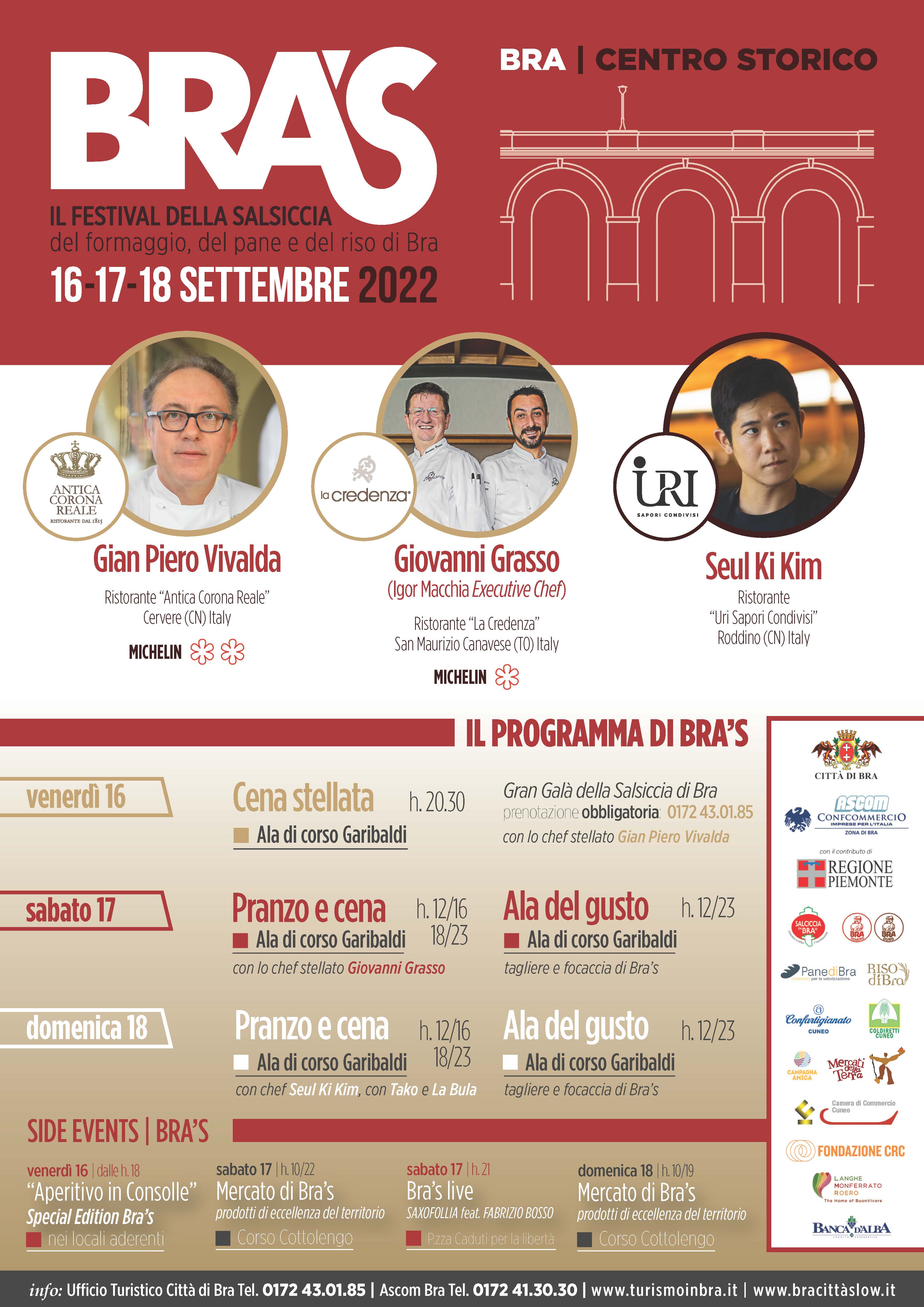 BRA’S entrerà poi nel vivo sabato 17 e domenica 18 settembre, con il Festival a ingresso libero: nella giornata di sabato il protagonista sarà chef Giovanni Grasso, La Credenza, stella Michelin di San Maurizio Canavese accompagnato dalla sua brigata, cucinerà dal vivo, nella gigante cucina a vista allestita sotto i portici dell’ala di corso Garibaldi, tre piatti ideati per l’evento. Grande protagonista sarà la Salsiccia di Bra, abbinata – con l’estro e la ricercatezza di uno storico chef stellato piemontese – alle tipicità locali: il riso, le verdure degli orti, il pane e il formaggio Bra Dop.