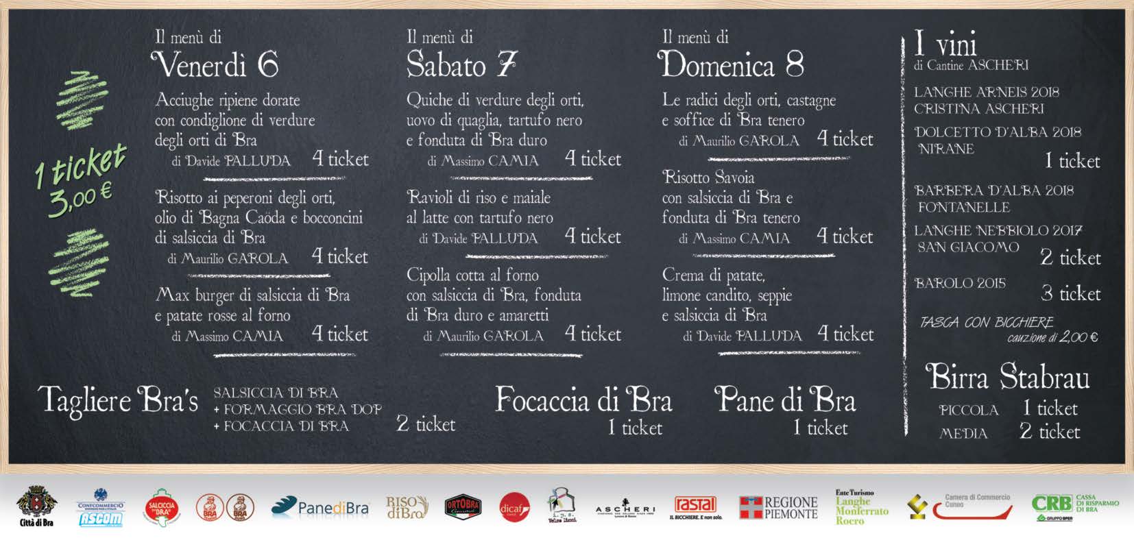 Oltre ai piatti cucinati dagli chef stellati, sarà possibile degustare anche il Tagliere Bra’s (salsiccia di Bra, formaggio Bra Dop e focaccia di Bra) a 6 euro e assaggiare la focaccia di Bra a 3 euro, il tutto in abbinamento con i vini della Cantine Ascheri di Bra.