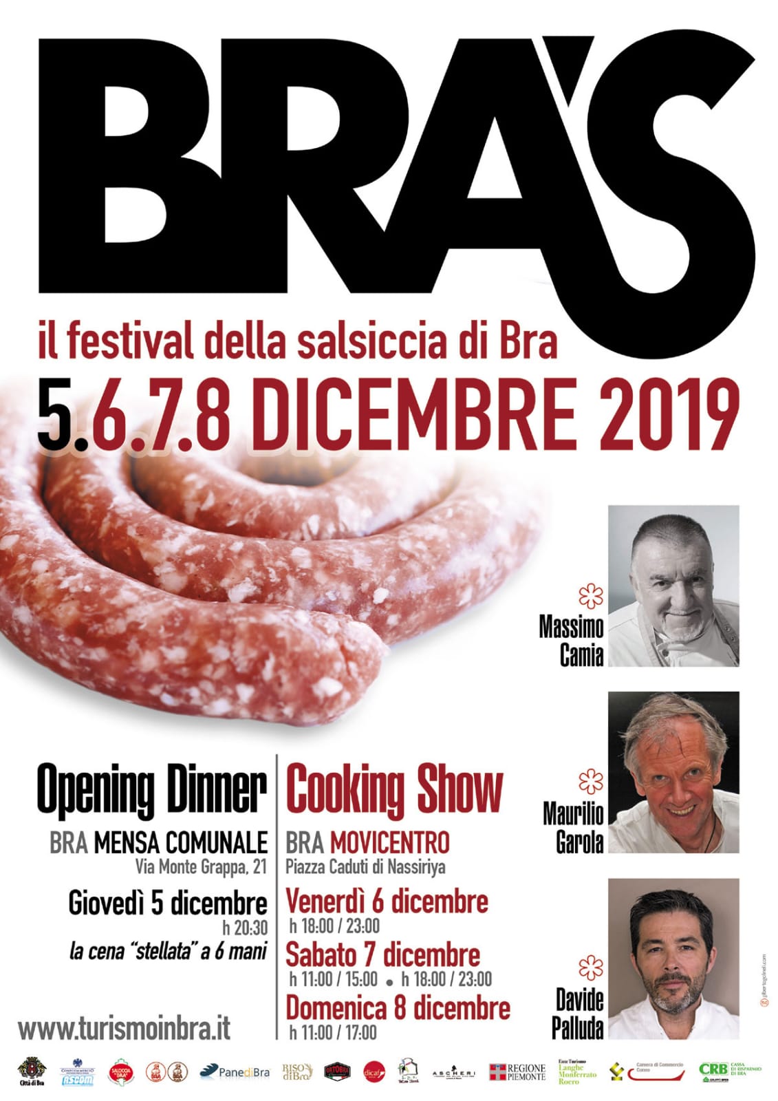 Tre grandi chef stellati di Langa e Roero celebrano la Salsiccia di Bra in abbinamento alle specialità locali: dal 6 all’8 dicembre 2019 al Movicentro della città della Zizzola va in scena “Bra’s – il festival della Salsiccia di Bra”, anticipato da una esclusiva cena stellata “a sei mani” in programma per giovedì 5.
