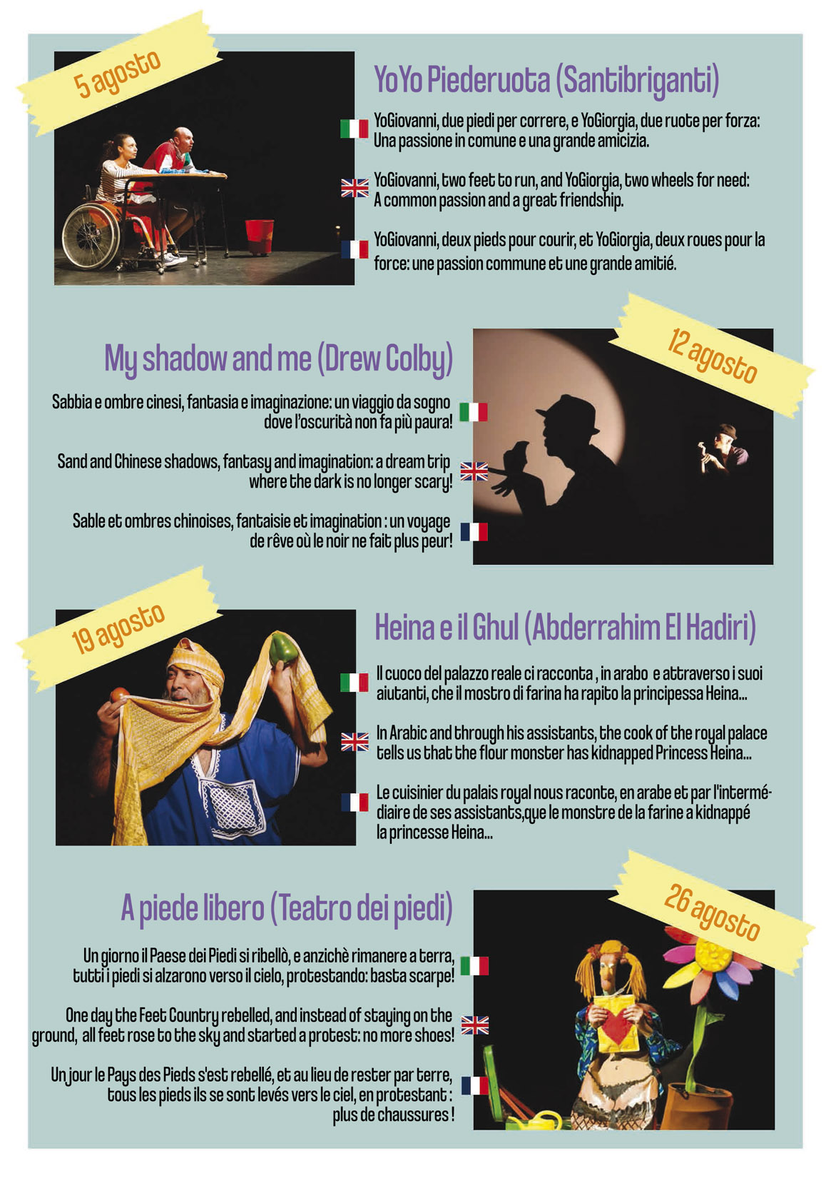 Dopo il respiro anglosassone ecco uno spettacolo interamente in arabo, ma assolutamente comprensibile per gli italiani, grazie alla mimica e alla maestria del protagonista Abdul, ovvero lo straordinario attore Abdherrahim El Hadiri. Sabato 19 agosto, andrà in scena, sempre alle 21, Heina e il Ghul, ovvero la leggenda della nascita del cous cous. É la fiaba araba di Heina, la figlia dello sceicco che, rapita dal terribile Ghul, il mostro di farina, (mostro bianco in un paese nordafricano!) è riuscita a fuggire e a tornare a palazzo. Sulla scena il cuoco di corte prepara un sontuoso cous cous per festeggiare l’evento e, danzando e cantando tra tegami e coperchi, racconta la mirabolante vicenda. Così gli ingredienti utilizzati (peperoni, zucchine, patate, cipolle) diventano gli attori, protagonisti di una grande avventura, salvo finire poi… in pentola.