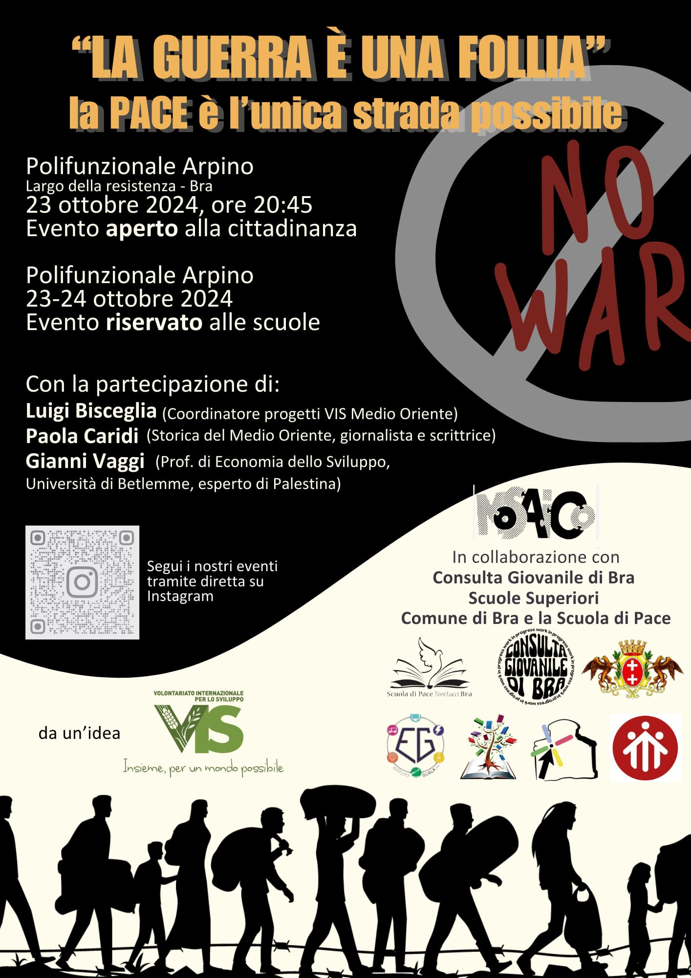 “La guerra è una follia. La pace è l’unica strada possibile”: è questo il titolo della nuova iniziativa lanciata dalla Scuola di Pace “Toni Lucci” di Bra insieme al VIS – Volontariato Internazionale per lo Sviluppo, che si concretizzerà in una serata pubblica in programma mercoledì 23 ottobre 2024.