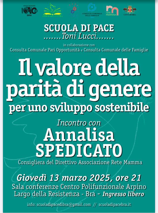 Nell’ambito del programma di iniziative Marzo Donna, lanciato dall’Amministrazione comunale per far riflettere sul tema della parità di genere, giovedì 13 marzo 2025 si svolgerà un nuovo appuntamento della Scuola di Pace “Toni Lucci” di Bra. L’evento, organizzato in collaborazione con la Consulta comunale Pari Opportunità e la Consulta comunale delle famiglie, ha come titolo “”Il valore della parità di genere per uno sviluppo sostenibile”.
