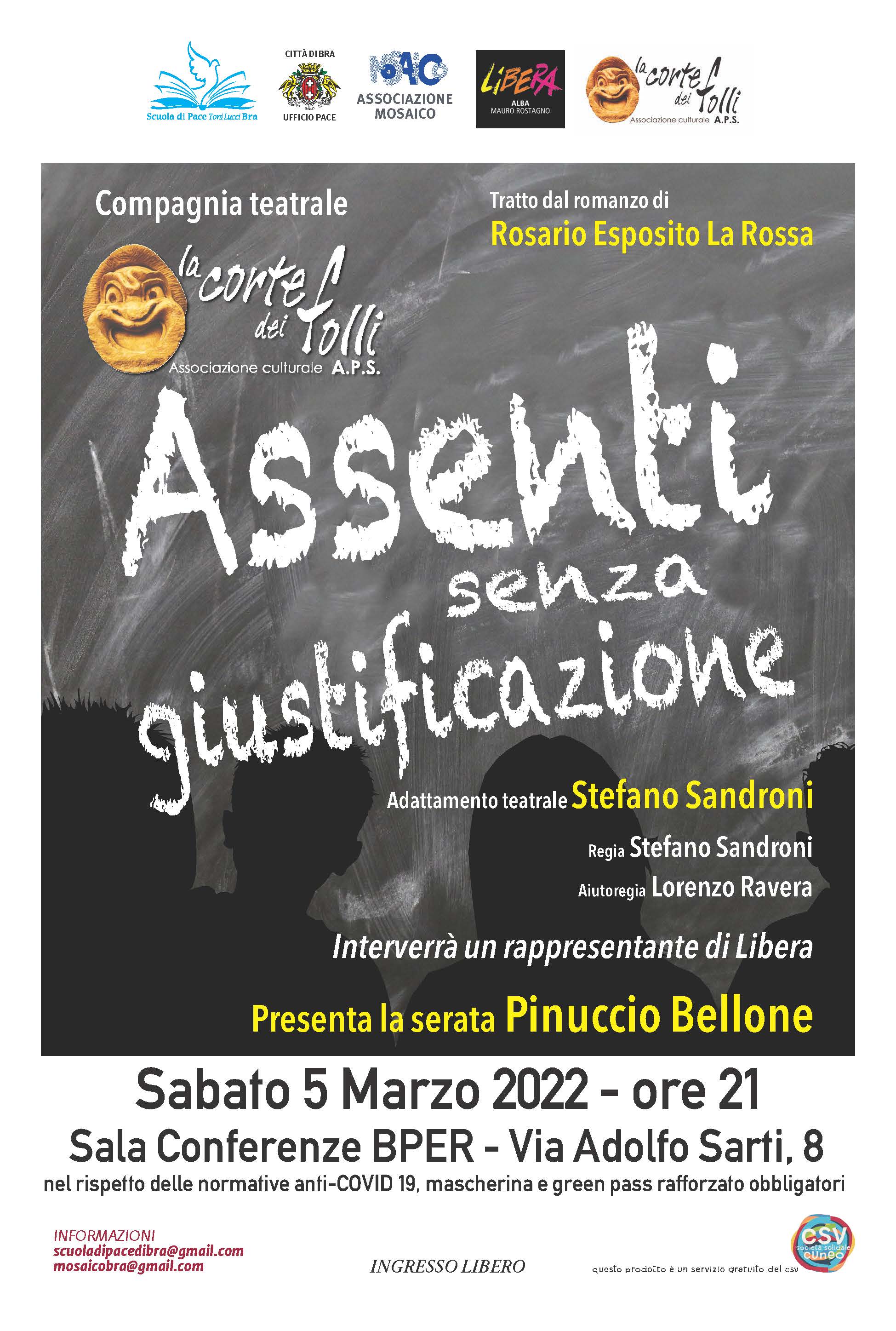 Sabato 5 marzo, alle 21 nella sala Conferenze BPER (via Sarti 8), prosegue l’attività della Scuola di Pace con lo spettacolo teatrale “Assenti senza giustificazione” della compagnia La Corte dei Folli, con regia di Stefano Sandroni.