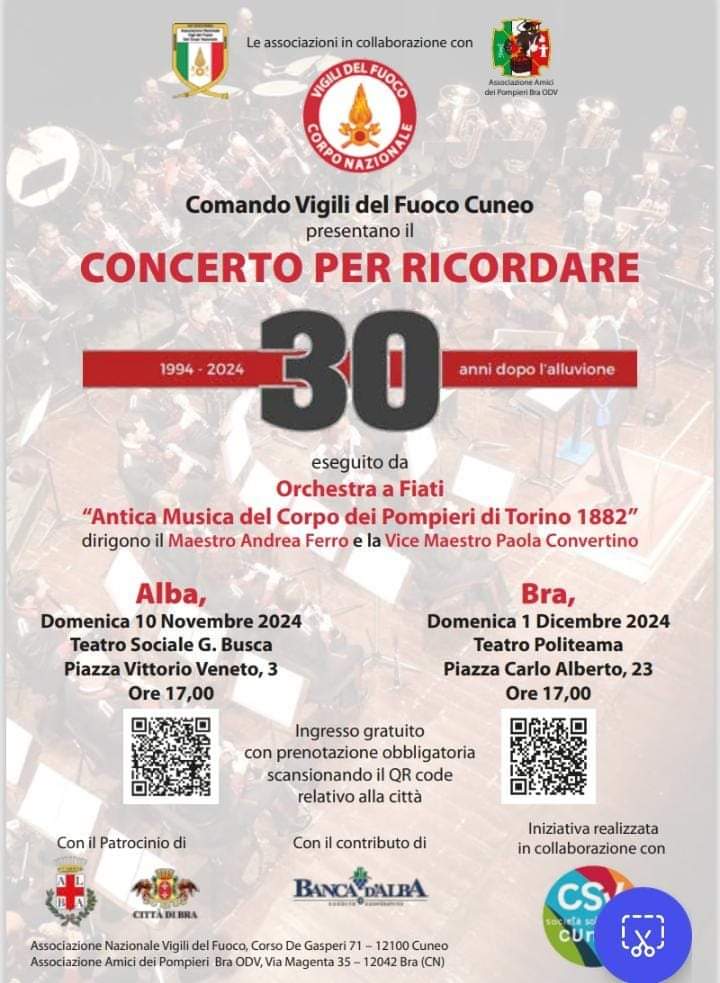 “Dopo l’analogo concerto svoltosi ad Alba – commenta il Sindaco Fogliato – siamo molto lieti di ospitare a Bra l’Orchestra dei Vigili del Fuoco per questo evento che ricorda i tragici momenti dell’Alluvione del ‘94 ma sottolinea anche l’importanza dell’impegno quotidiano delle persone che, da effettivi e da volontari, indossano la divisa dei Vigili del fuoco”.