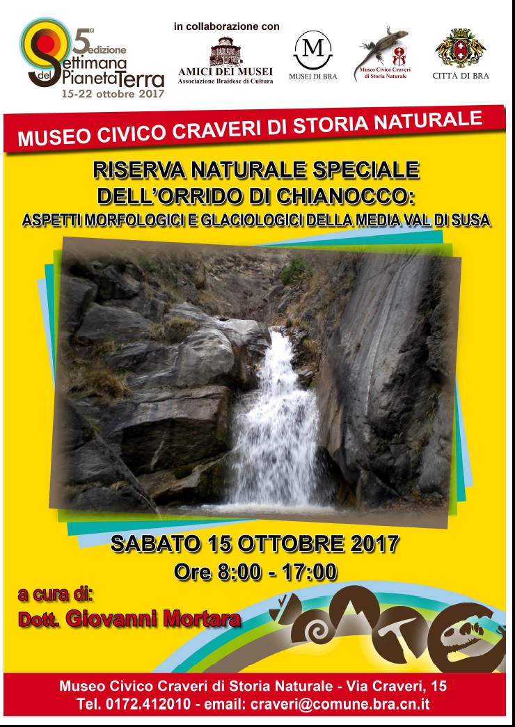 In occasione della quinta edizione della “Settimana del Pianeta Terra”, il Museo civico di Storia Naturale “Craveri” di Bra organizza per domenica 15 ottobre 2017 una visita guidata all’Orrido di Chianocco in Val di Susa, in collaborazione con gli Amici dei Musei.