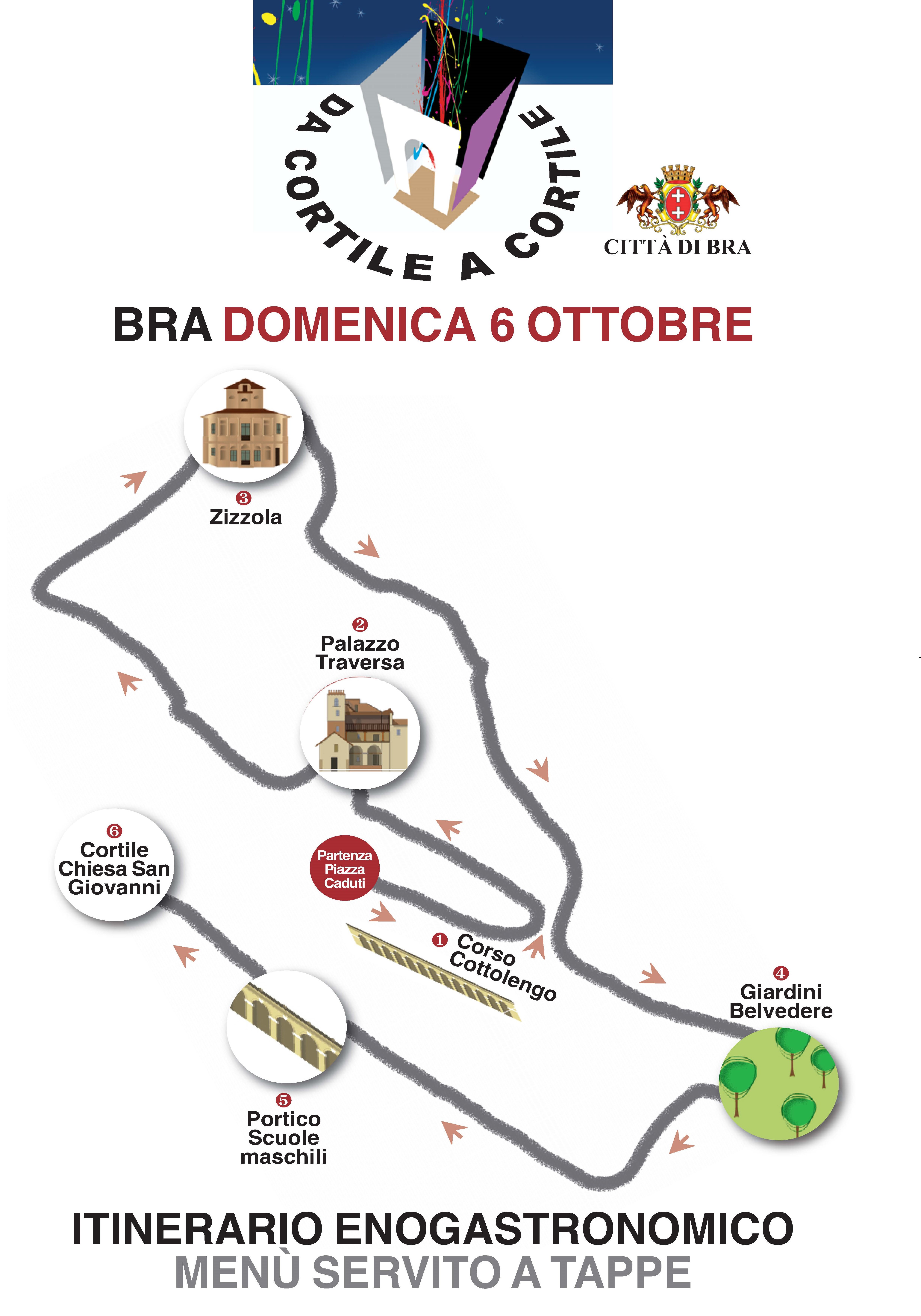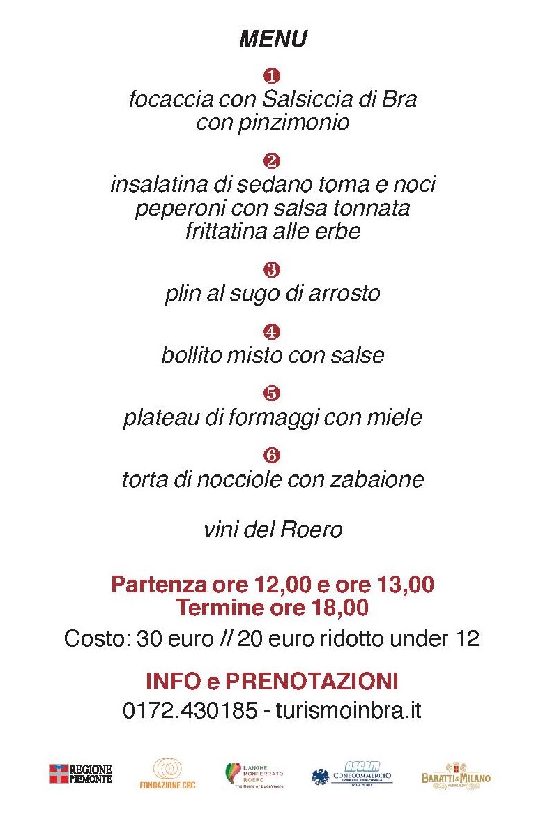 La partenza è prevista in piazza Caduti per la Libertà; due i possibili orari, alle 12 e alle 13. Il tour prevede come prima tappa l’ala di corso Garibaldi, dove si gusterà focaccia con salsiccia di Bra e pinzimonio; tappa quindi a Palazzo Traversa per un “appuntamento” con insalatina di sedano, toma e noci, peperoni con salsa tonnata e frittatina alle erbe; si procede poi alla volta della Zizzola per essere premiati con un bel piatto di ravioli del plin al sugo di arrosto; si scende ai giardini del Belvedere della Rocca per assaggiare il bollito misto con salse; la carovana si sposta quindi sotto il portico della primaria Levi Montalcini (le scuole Maschili nella memoria cittadina) per gustare un plateau di formaggi con miele; infine il dolce, torta di nocciole con zabaione, distribuito presso la chiesa di San Giovanni. Tutti i piatti saranno accompagnati da vini del Roero.