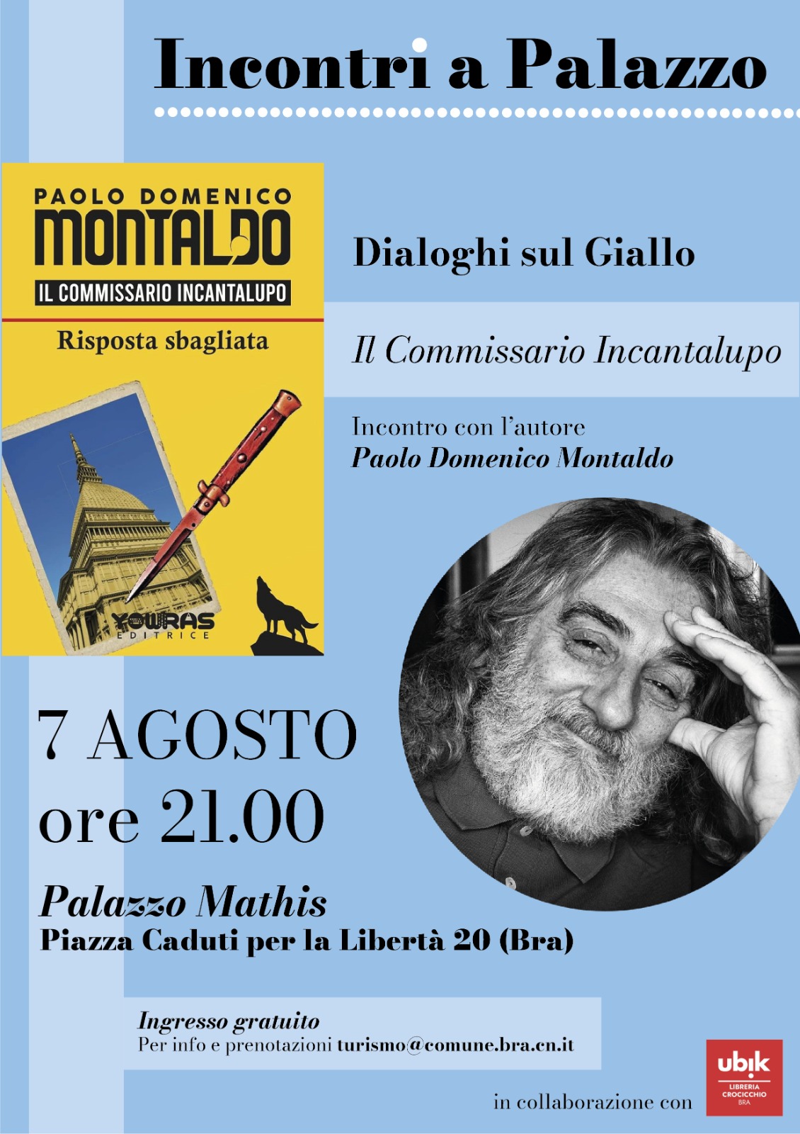 La prima settimana di agosto vedere ritornare a Bra l’appuntamento è con “Incontri a Palazzo”, la rassegna estiva di incontri letterari organizzata dalla libreria Crocicchio Ubik Bra in collaborazione con il Comune. Mercoledì 7 agosto 2024 alle 21, a Palazzo Mathis si terranno i “Dialoghi sul giallo”, ovvero l’incontro con l’autore Paolo Domenico Montaldo che presenta “Il Commissario Incantalupo. Risposta sbagliata” (ed. Yowras Editrice).