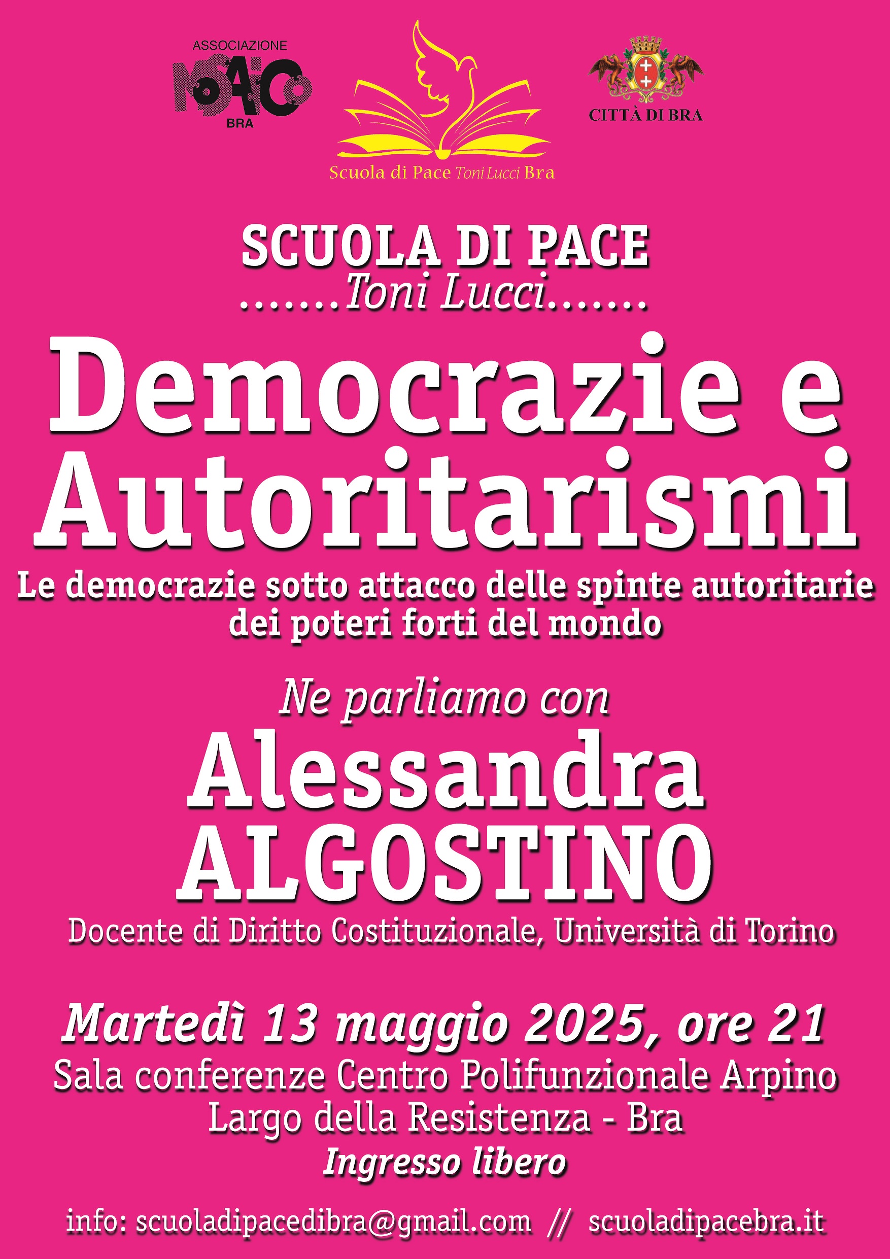 Nel suo 33° anni di attività la Scuola di Pace “Toni Lucci” di Bra continua a proporre appuntamenti legati a tematiche di stretta attualità, in grado di interessare e far riflettere un’ampia fascia della popolazione. Il prossimo evento in calendario è fissato per martedì 13 maggio 2025, quando a partire dalle 21 presso la sala conferenze del Centro polifunzionale “Giovanni Arpino”, in largo della Resistenza, si parlerà di “Democrazie e autoritarismi”. A condurre la serata sarà la prof. Alessandra Algostino docente di diritto costituzionale all’Università degli Studi di Torino.