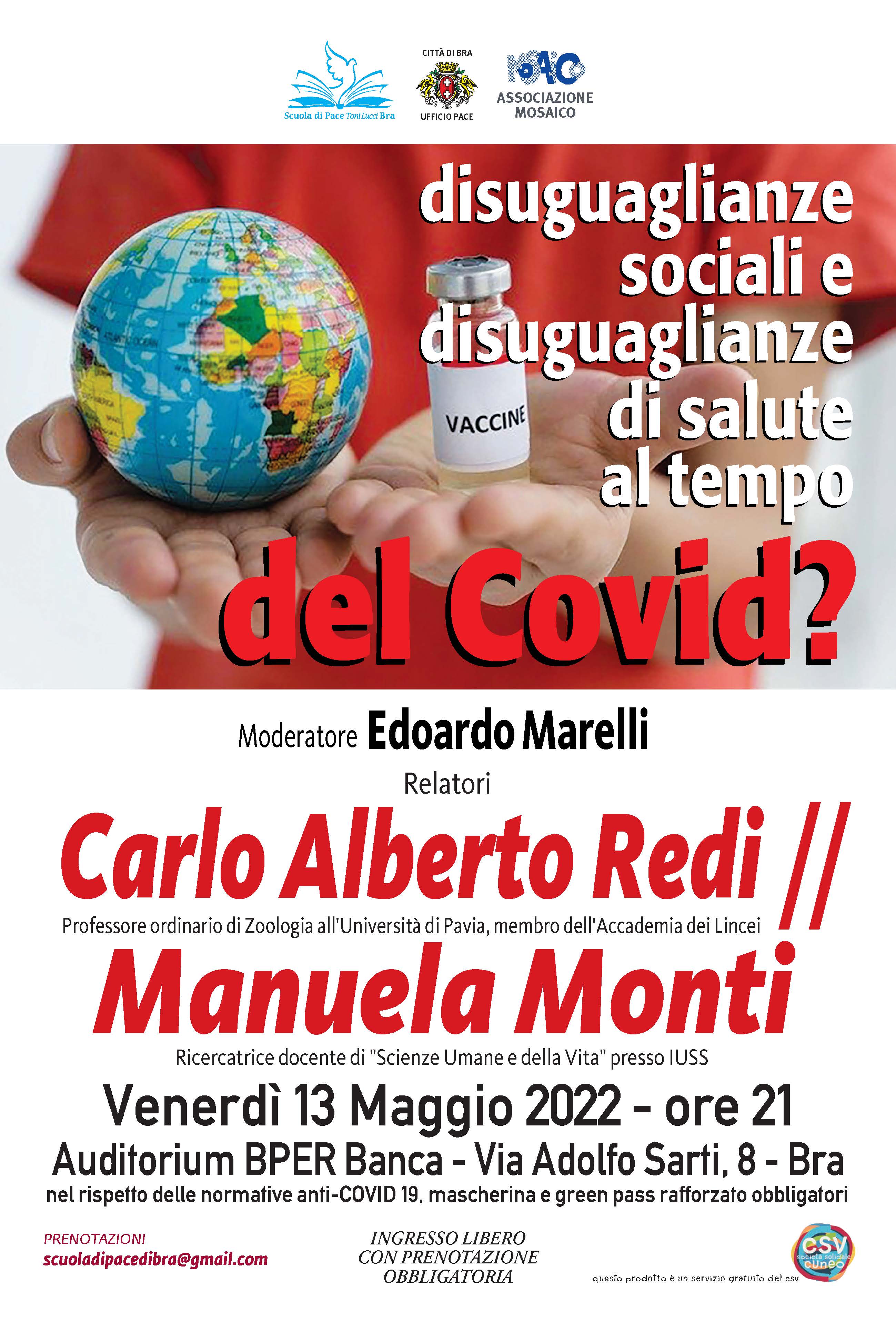 Recenti evidenze suggeriscono che l’esperienza della pandemia da Covid 19 non è stata vissuta in modo egualitario dalla società italiana, con tassi più elevati di infezione e mortalità tra le comunità più svantaggiate. Sarà questo uno dei temi al centro del nuovo appuntamento organizzato dalla Scuola di pace “Toni Luci” di Bra per venerdì 13 maggio 2022, quando i prof. Carlo Alberto Redi, ordinario di Zoologia all’Università di Pavia, docente presso lo IUSS e membro dell’Accademia dei Lincei, e Manuela Monti, ricercatrice docente di Scienze umane e della vita presso l’Istituto universitario di studi scientifici (IUSS) di Pavia, discuteranno di “Disuguaglianze sociali e disuguaglianze di salute al tempo del Covid”.