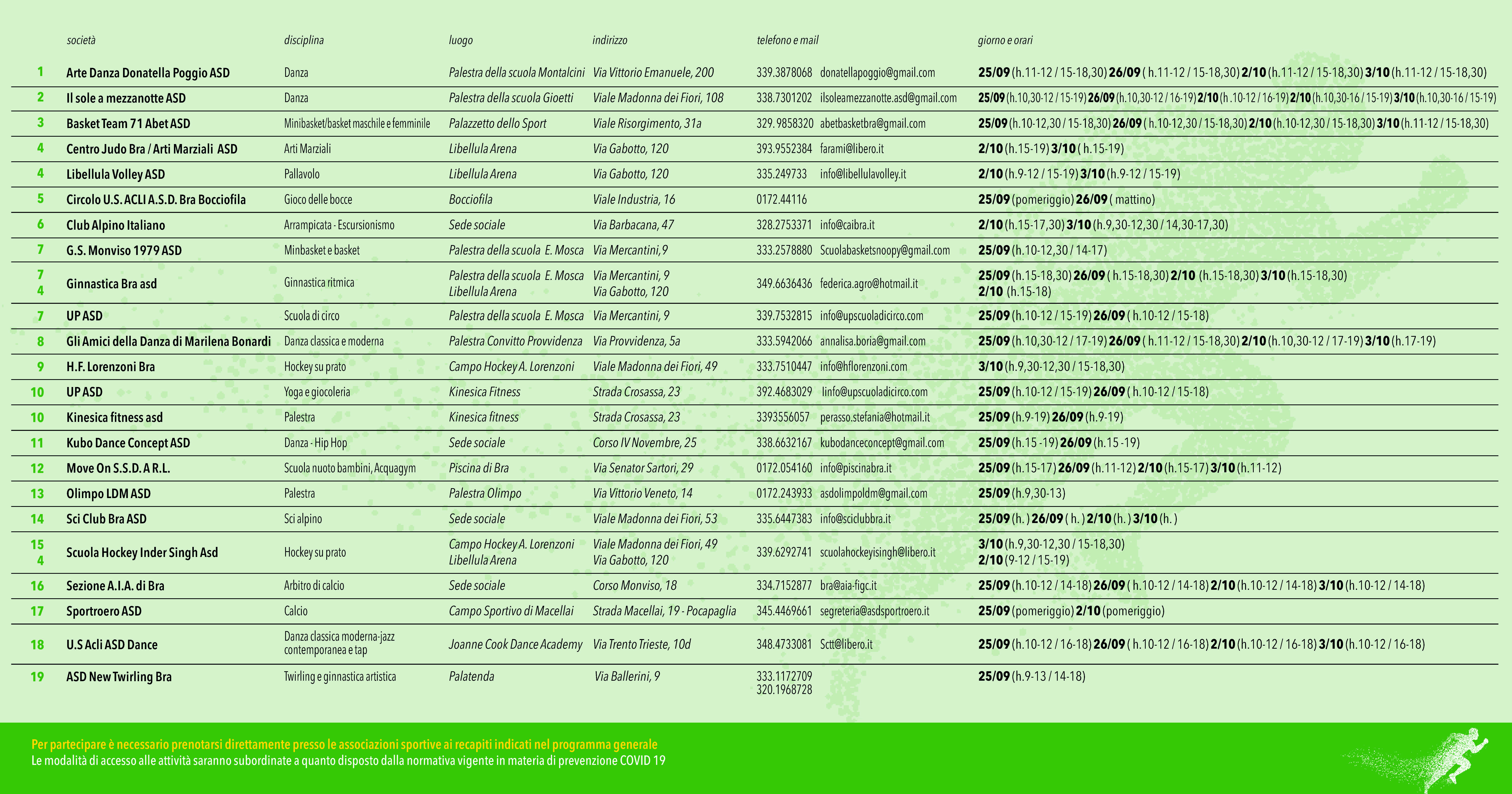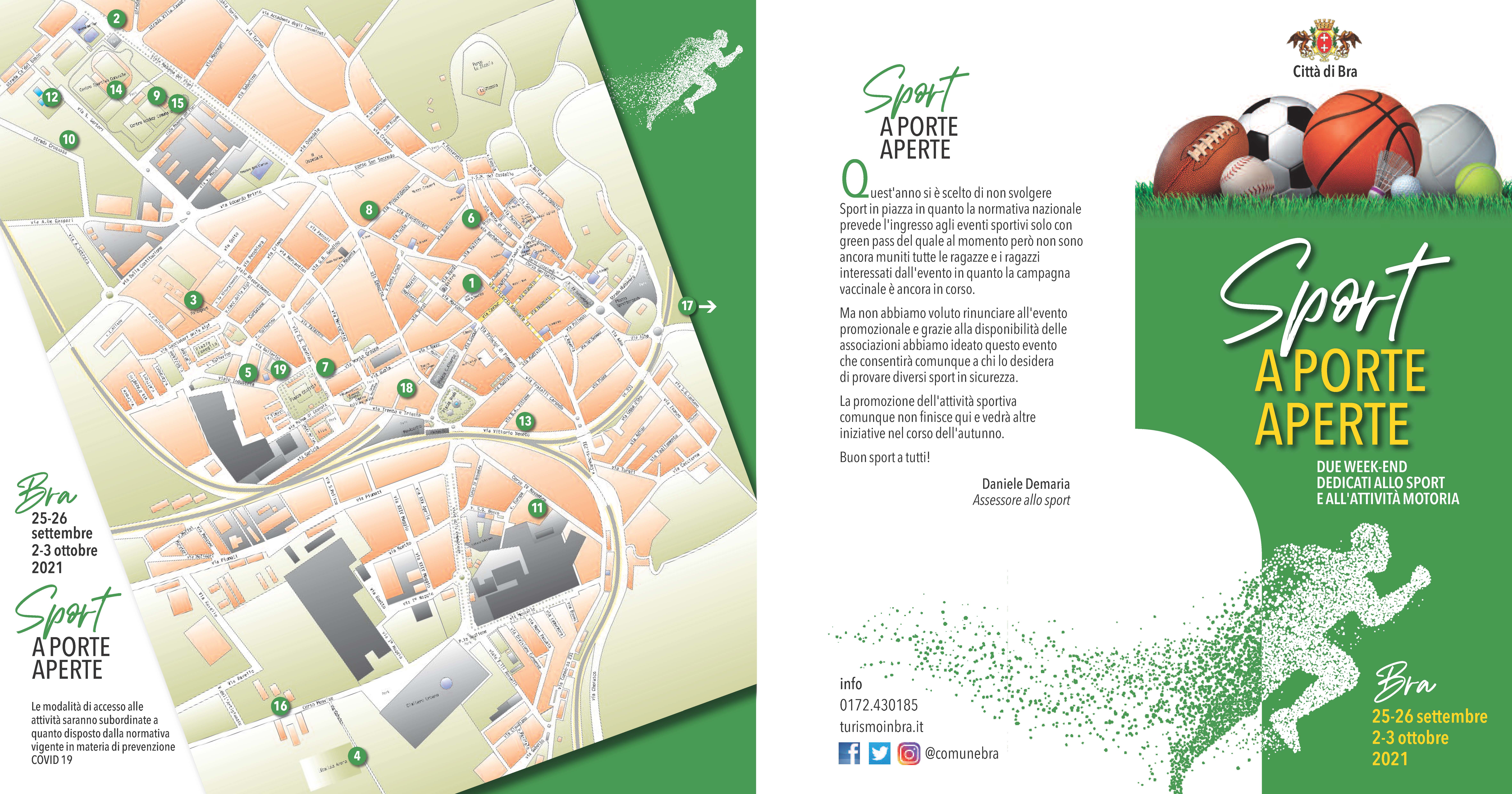 Le restrizioni imposte dalle norme anti Covid non fermano lo sport braidese. Quest’anno, vista la difficoltà di riproporre il tradizionale appuntamento con “Sport in Piazza”, l’Amministrazione comunale e le associazioni sportive del territorio hanno deciso di ricorrere a una formula diversa. L’appuntamento si chiama “Sport a porte aperte” e prevede per due fine settimana (il 25 e 26 settembre 2021 e il 2 e 3 ottobre) la possibilità di organizzare degli appuntamenti con i singoli sodalizi per provare in piena sicurezza le diverse discipline sportive.