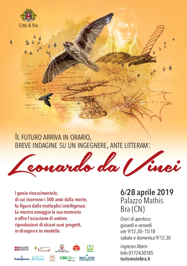 “Future arrives on time”: that’s the title of the new Exhibition at palazzo Mathis form 6th to 28th April 2019. 500 yeras after the death of the genius Leonardo Da Vinci (famour painter, sculptor, musician, inventor and engieneer), the eshibition shows some models of the innovative machinery designed by Leonardo. The visitors colud also see some of the books “translated” by one of the most researcher of Leonardos’ work, the braidese Giovanni Piumati. Thanks to multimedia and interactive display, it will be possible “leag through” the pages of the Codice Atlantico and Manuale di Anatomia. uto che, ancora oggi, non ha pari nel campo degli studi leonardeschi”. The exhibition is open (free entrance) on Thursay and Friday from 9 to 12,30 am and from 3 to 6 pm. On Saturday and Sunday from 9 to 12.30 am. More info at turismo@comune.bra.cn.it