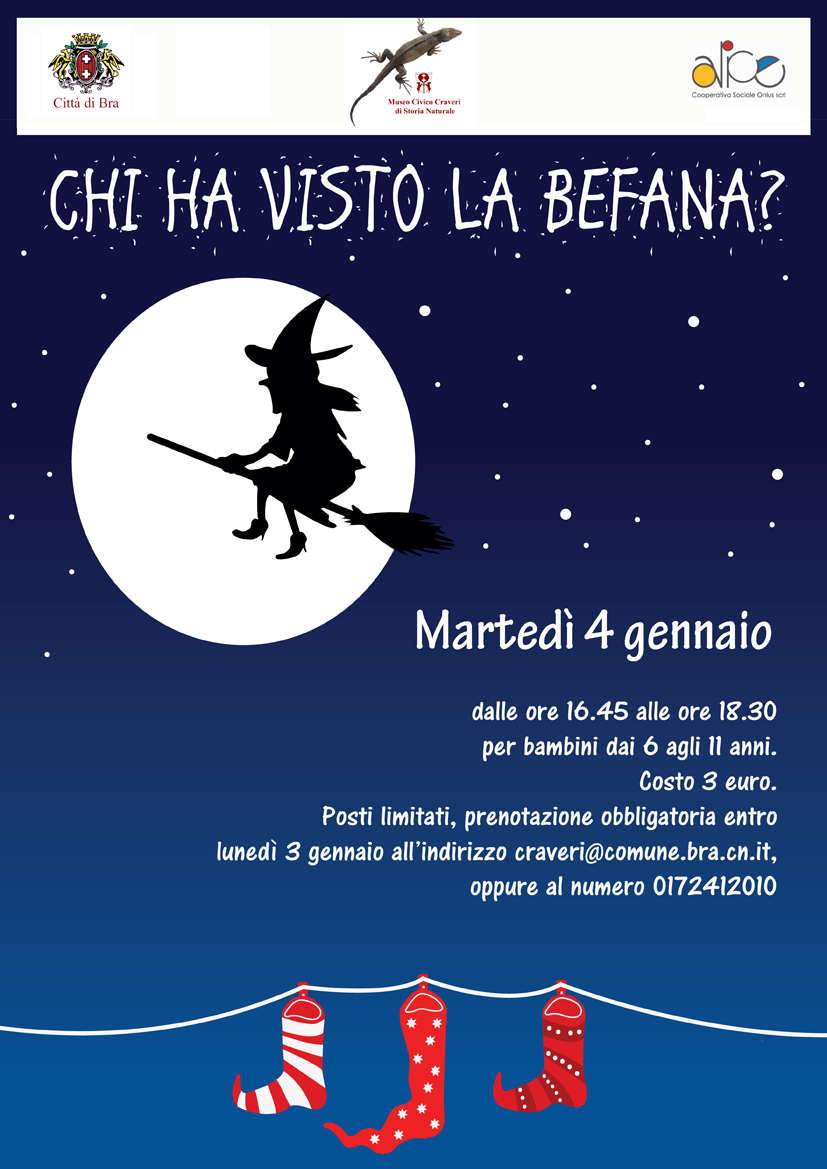 “Chi ha visto la Befana?” è il primo incontro, in programma  martedì 4 gennaio 2022 dalle 16.45 alle 18.30 al Museo civico “Craveri”: i partecipanti potranno dare libero sfogo alla fantasia, realizzando con il supporto degli operatori calze e piccoli oggetti, in attesa della simpatica vecchina sulla scopa. Costo 3 euro, prenotazione obbligatoria entro lunedì 3 gennaio chiamando lo 0172.412010 o scrivendo a: craveri@comune.bra.cn.it.