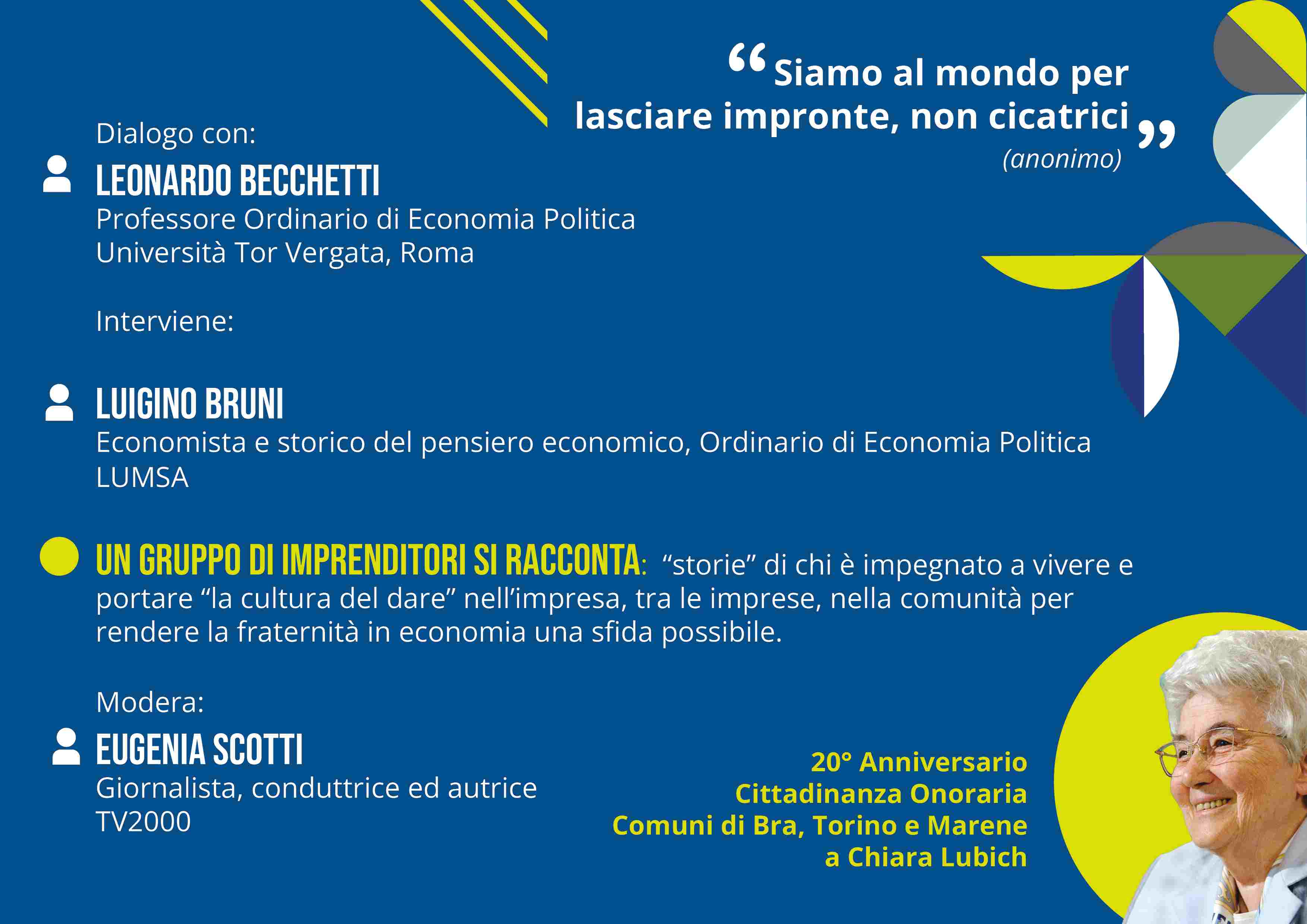 Ma il focus dell’evento saranno soprattutto le “storie” di un gruppo di imprenditori AIPEC, impegnati a vivere e portare “la cultura del dare” nella reciprocità nell’impresa, tra le imprese, nella comunità per rendere la fraternità in economia una sfida possibile. Una occasione poi per ricordare il 20° anniversario del conferimento della cittadinanza onoraria della città di Bra a Chiara Lubich, Fondatrice del Movimento dei Focolari ed ispiratrice del progetto dell’Economia di Comunione.